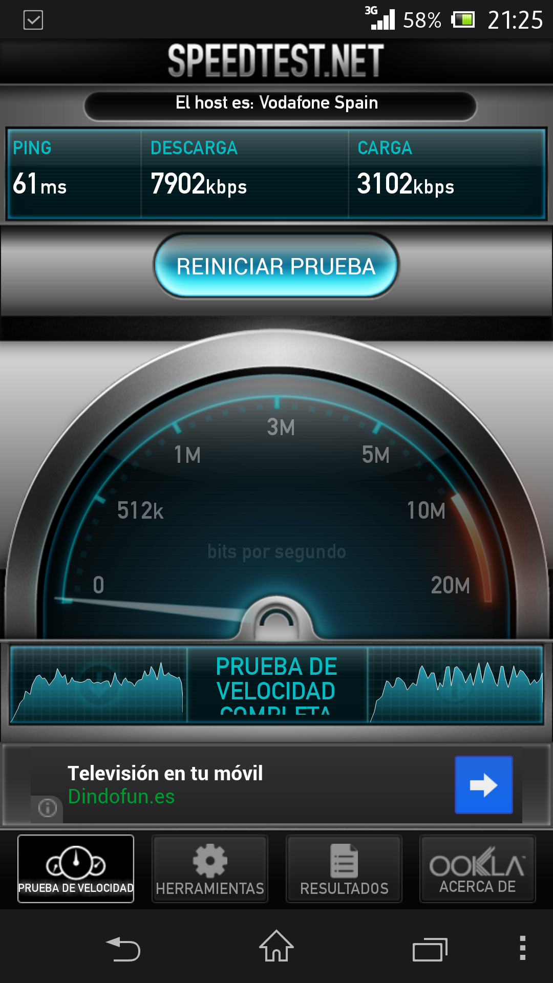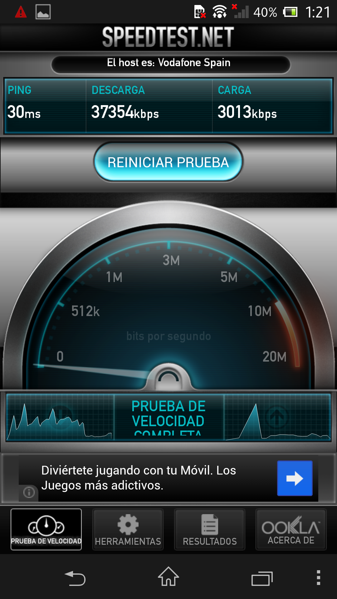 En las pruebas que realizamos la velocidad de conexión tanto por Wi-Fi como por 3G fue muy satisfactoria. Se alcanzaron 37 Mbps de bajada y 3 Mbps de subida en Wi-Fi con una conexión de cable de ONO, y 7,9 Mbps de bajada y 3,1 Mbps de subida con una conexión 3G de Movistar.