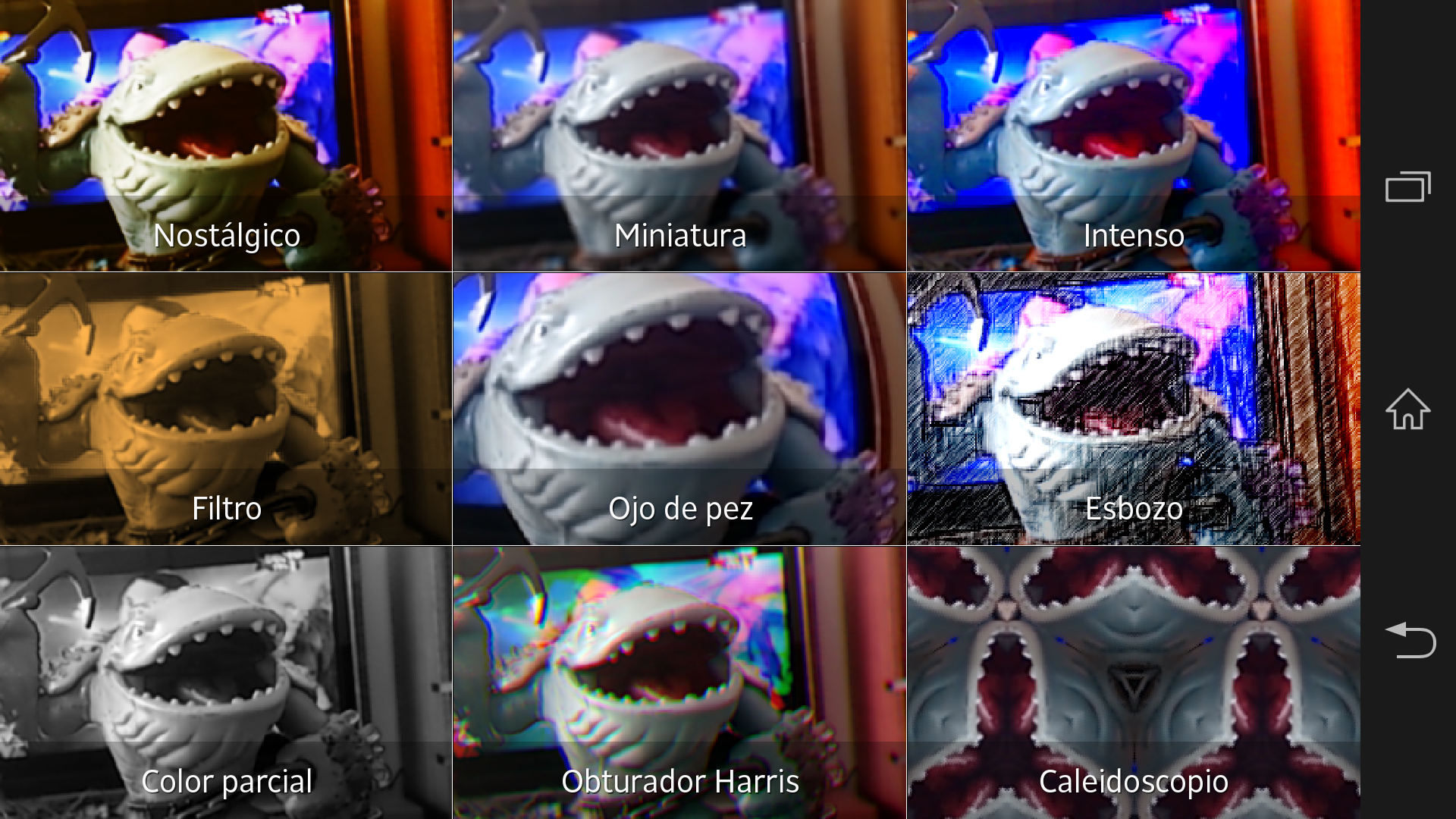 El modo de efecto de imagen permite escoger entre nueve efectos – nostálgico, miniatura, intenso, filtro, ojo de pez, esbozo, color parcial, obturador Harris y caleidoscopio – que se aplican y muestran en la pantalla en tiempo real sobre la imagen que captura la cámara.