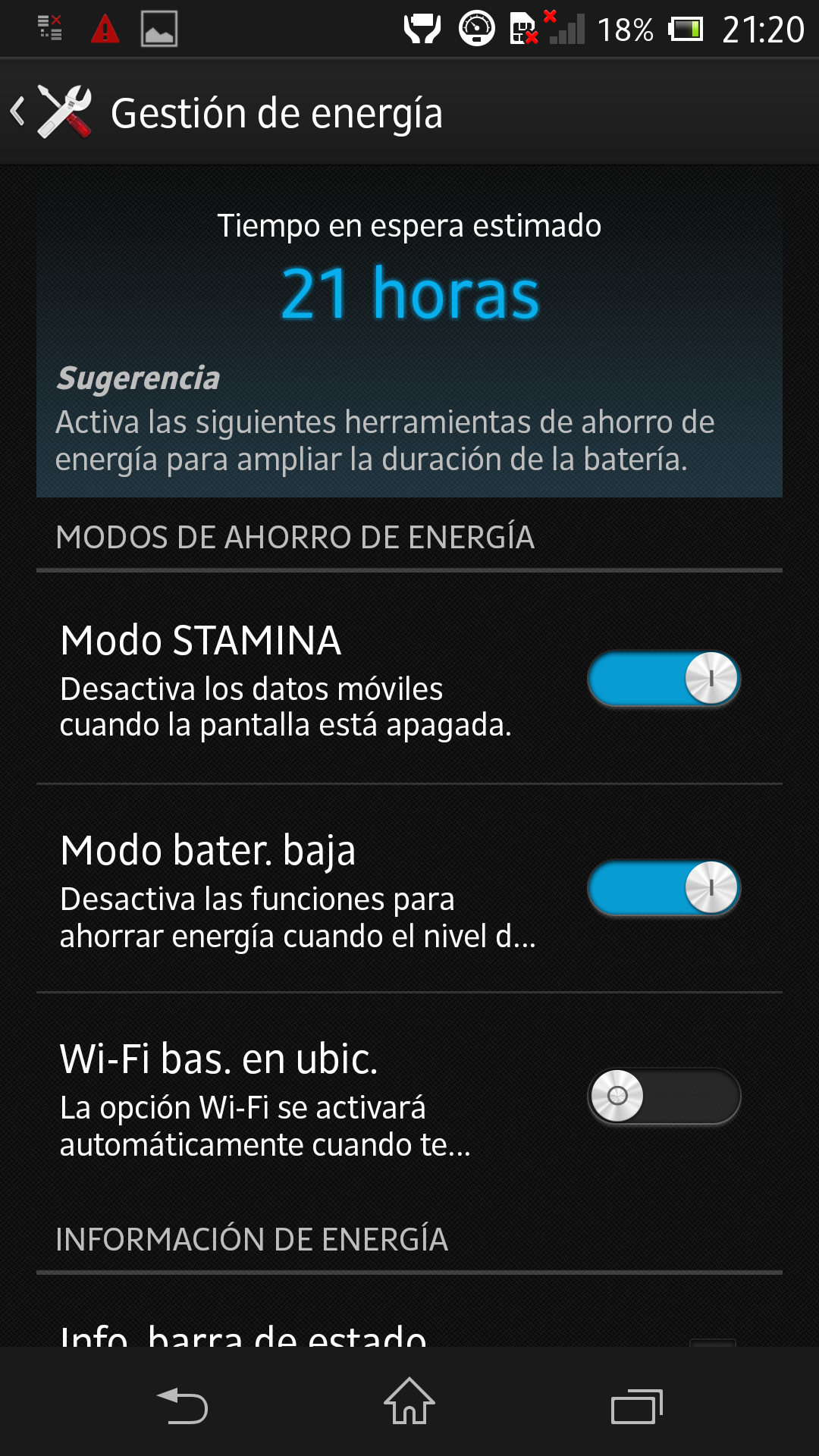 Además también incluye el modo Batería Baja, que permite seleccionar qué funciones dejan de estar activas cuando la batería disminuye por debajo de un umbral (por defecto, 30%). Entre las funciones seleccionabbles tenemos el brillo de pantalla, el tiempo de espera de pantalla, la vibración al pulsar la pantalla, la conectividad Wi-Fi y Bluetooth, el receptor GPS, la sincronización automática y los datos móviles.