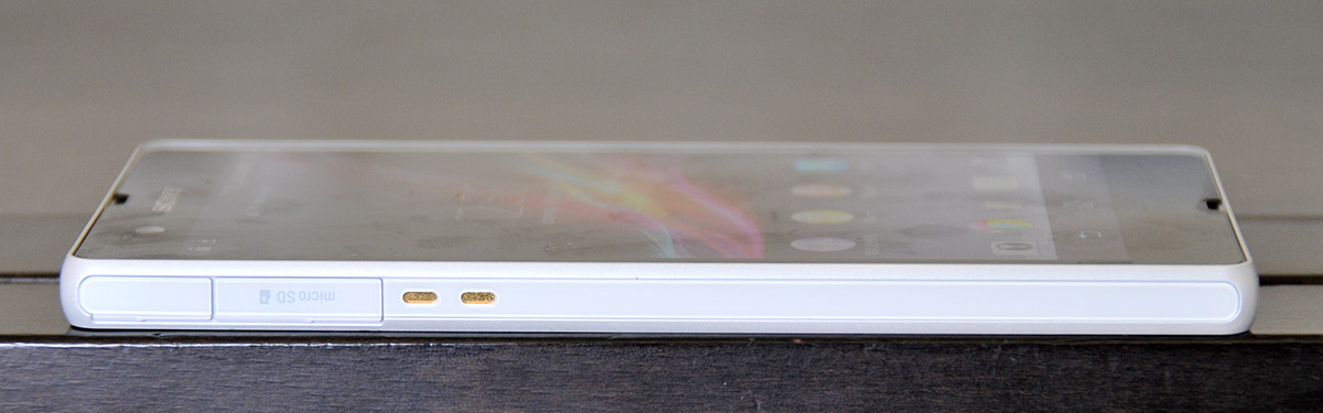 El lateral izquierdo únicamente está ocupado por dos compartimentos: el del conector micro-USB (que a primera vista es difícil de encontrar) y el de la tarjeta micro-SD. Debajo de estos compartimentos hay unos contactos metálicos para accesorios (por ejemplo bases de carga o de sonido por contacto).