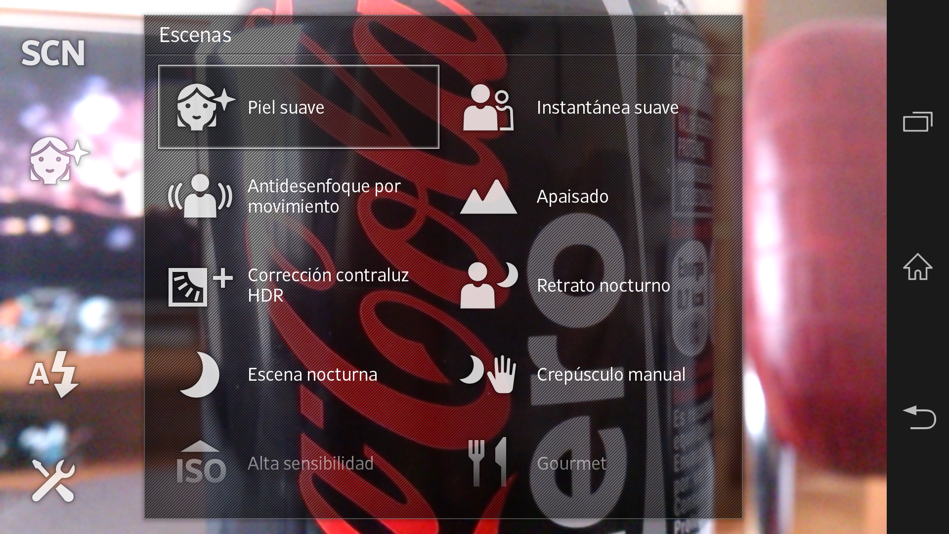 El modo escena permite elegir entre 17 escenas: piel suave (predeterminada), instantánea suave, antidesenfoque por movimiento, apaisado (cuya traducción correcta debería ser paisaje), corrección contraluz HDR, retrato nocturno, escena nocturna, crepúsculo manual, alta sensibilidad, gourmet, mascota, playa, nieve, fiesta, deportes, documento y fuegos artificiales. El número de opciones casi se ha doblado respecto a las 9 escenas que ofrece el Sony Xperia T.