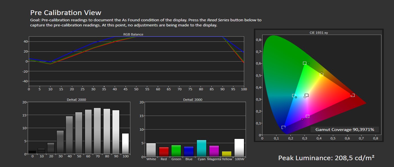 La cobertura del espacio de color sRGB es algo limitada, en torno a un 90%, probablemente porque la pantalla está calibrada para NTSC, lo cual explicaría que los colores tiendan a estar sobresaturados. La temperatura de color es 7.323ºK, un valor por encima del valor de referencia de 6.500ºK, por lo que la pantalla presenta un tinte azulado.