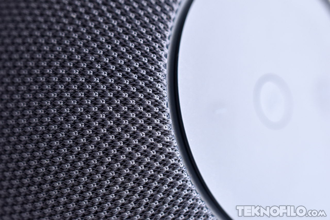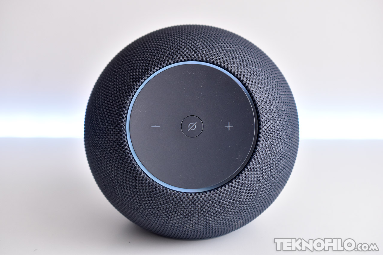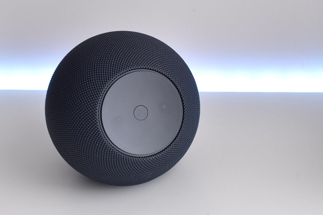 En la parte frontal, un panel circular plano concentra los controles táctiles de volumen (con los iconos “+” y “–”) y el botón para silenciar el micrófono, rodeado por un anillo LED que se ilumina cuando el dispositivo requiere atención, subes/bajas el volumen o responde a comandos de voz.