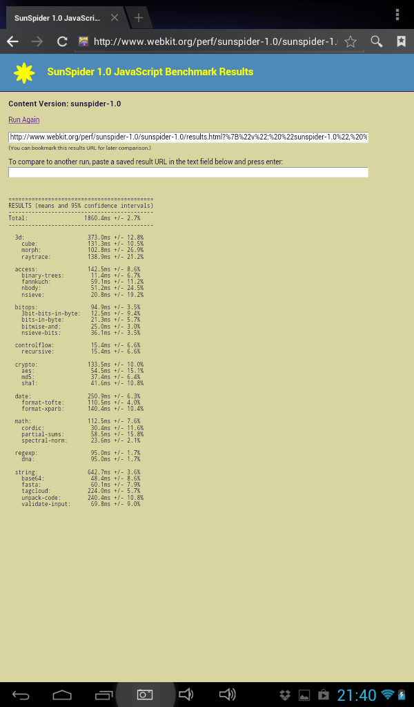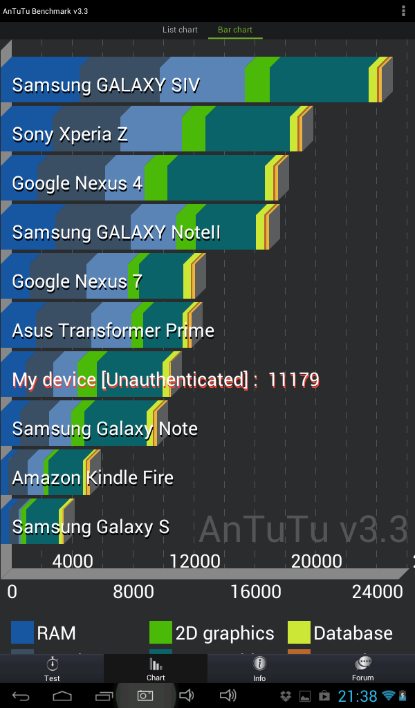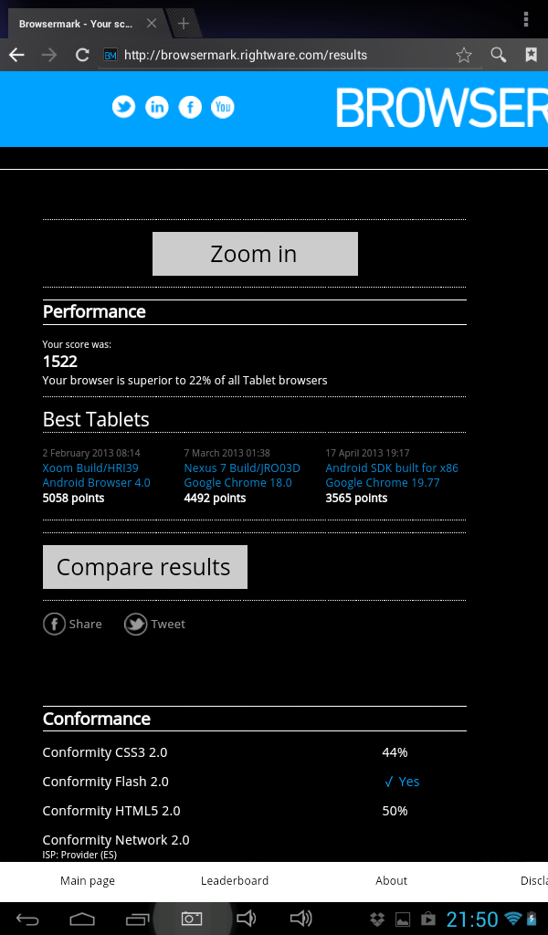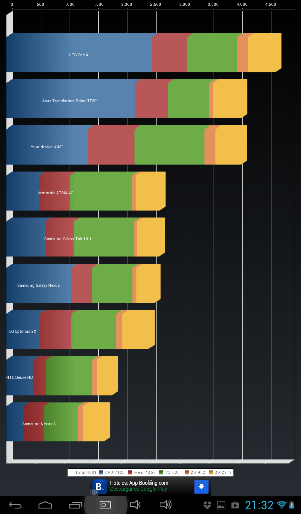 En las pruebas sintéticas de rendimiento, el Energy Tablet s10 Dual ha entregado 4.081 puntos en benchmark Quadrant y 11.179 en AnTuTu. En las pruebas de rendimiento del navegador, el test Sunspider ha dado 1.860 ms. y BrowserMark 2.0 ha entregado 1522 puntos (un 22% mejor que todos los navegadores de tablets). Estos resultados son dignos de mención ya que el rendimiento de este tablet está muy por encima de otros similares que hemos probado como el Galaxy Tab 2 10.1″ o el Wolder miTab LION 10.1″, suponemos que gracias a la GPU que incorpora.