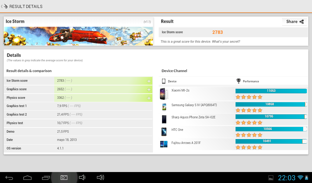 Hemos probado la capacidad gráfica del Energy Tablet s10 Dual con el benchmark 3DMark y los resultados han sido bastante buenos. Durante la ejecución de la prueba la tasa de refresco de la imagen ha rondado los 15-25 fps la mayor parte del tiempo y el resultado final ha sido 2.783 puntos en el test el Ice Storm. Este resultado es, de nuevo, significativamente superior a otros tablets similares y confirma el buen rendimiento del chip gráfico de este tablet.