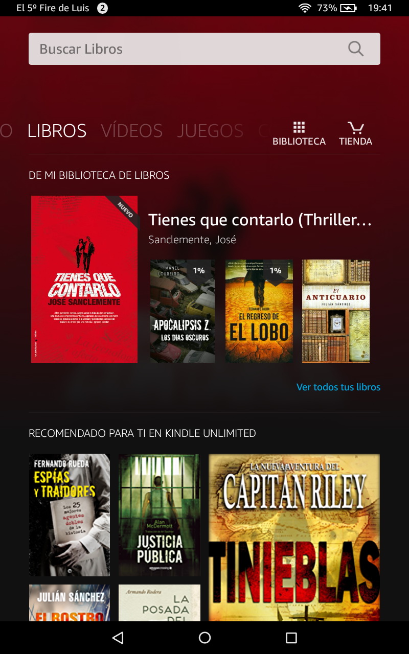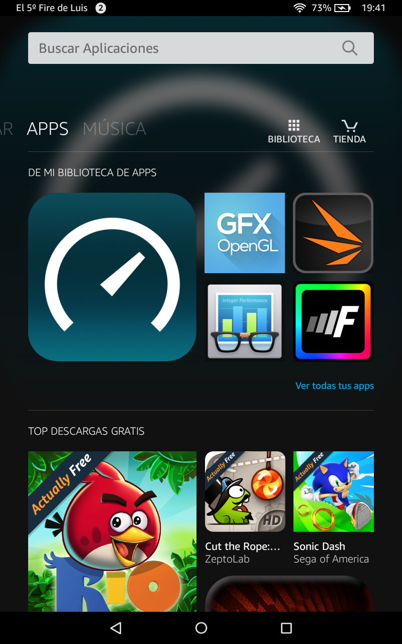 Las pestañas Libros, Música, Juego y Aplicaciones nos llevan a páginas donde encontramos los elementos de estas categorías que tenemos instalados en nuestro tablet, y siempre hay un acceso directo a Tienda para adquirir contenido adicional de Amazon.