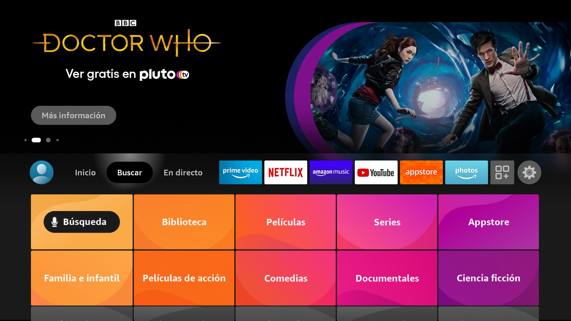 - Buscar, que permite realizar una búsqueda en texto libre, acceder a la Biblioteca o navegar por las categorías de contenido (Películas, Series, Appstore, Familia e infantil, etc.)
