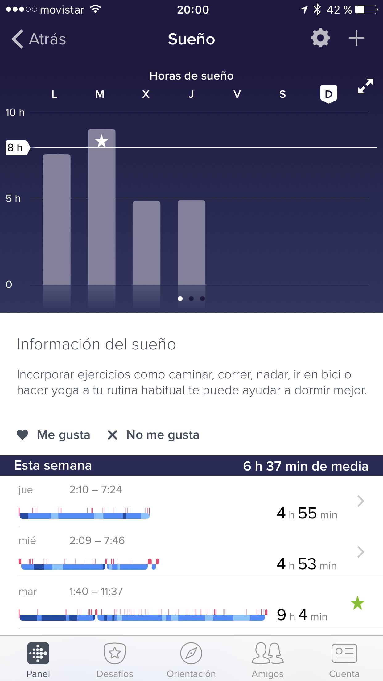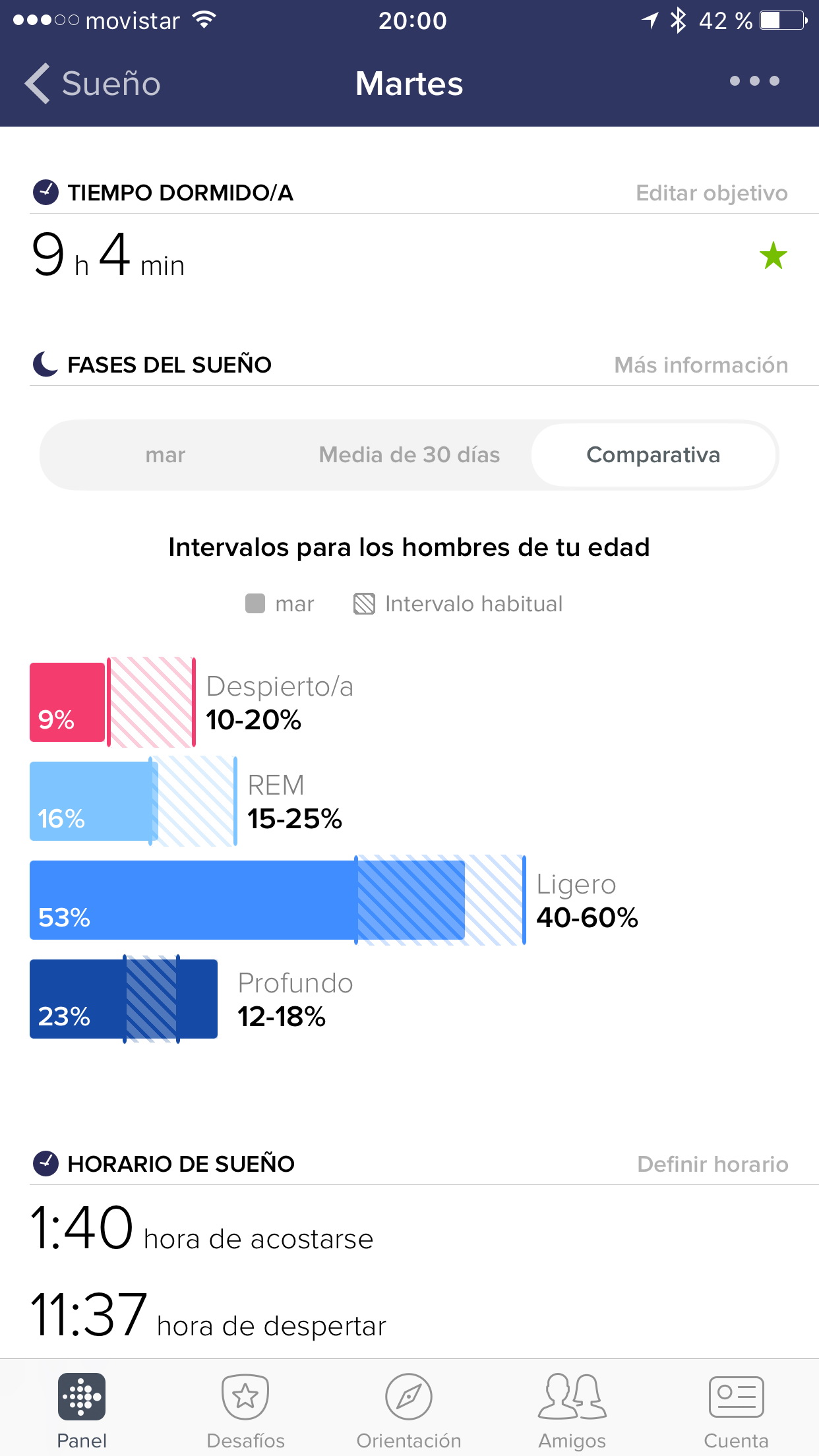 La app de Fitbit muestra una gráfica con las horas de sueño de cada día y, si pulsas sobre un día en concreto, puedes ver cómo has ido cambiando entre las fases REM, sueño ligero y sueño profundo. También puedes ver el porcentaje de tiempo que has pasado en cada fase y, si pulsas el botón Comparativa, puedes ver cómo se comparan tus estadísticas con las de otras personas de tu misma edad y sexo.