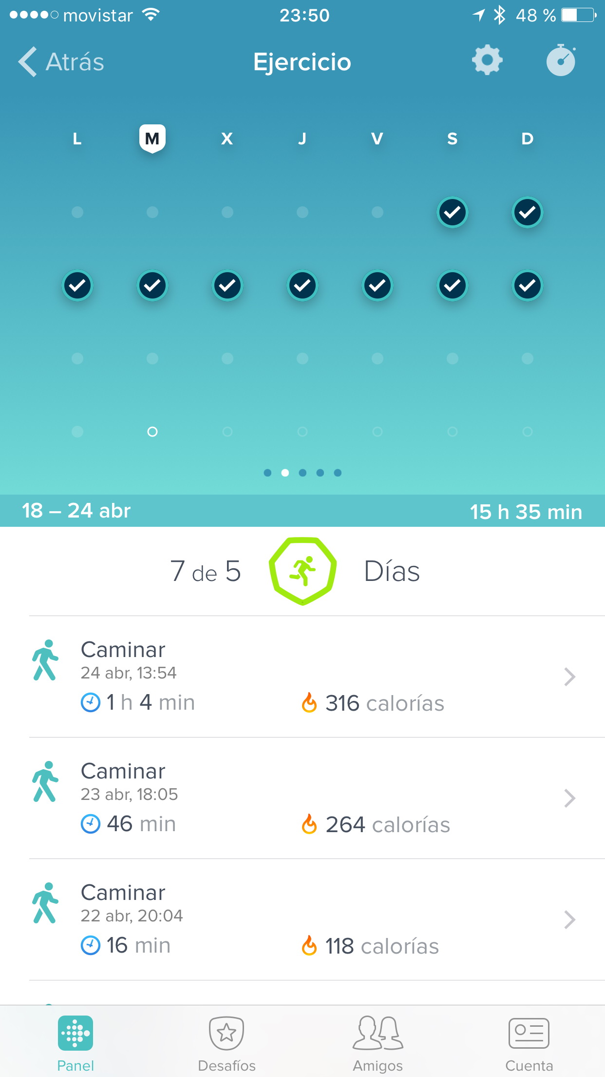 Tus amigos se muestran en una pestaña de la aplicación y puedes ver lo activos que han estado en comparación contigo.