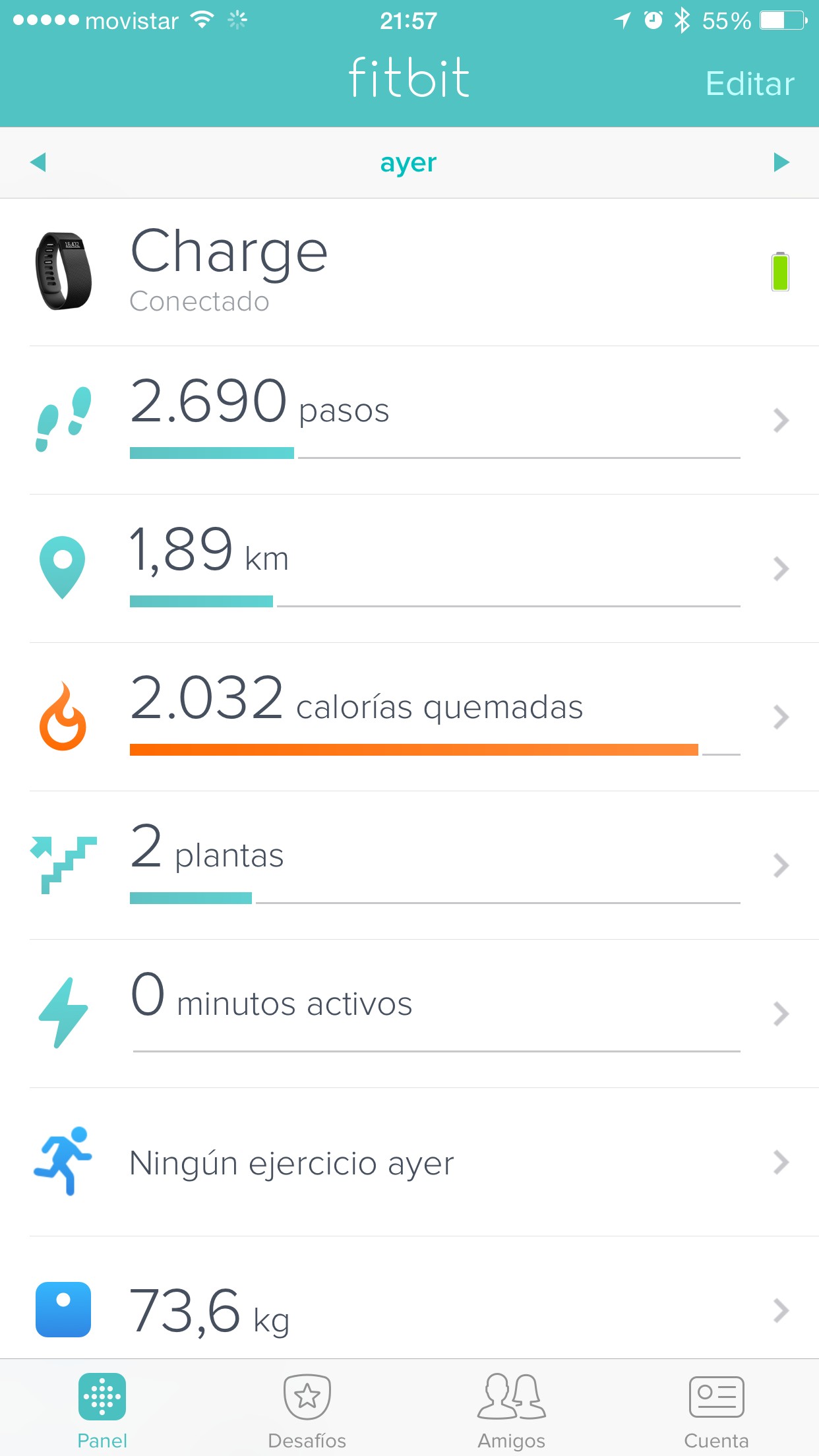 La aplicación de Fitbit para el teléfono móvil recopila la información de la pulsera relativa a pasos, distancia, calorías y pasos; y la muestran de forma agregada con gráficas muy vistosas por día, semana, mes, etc.