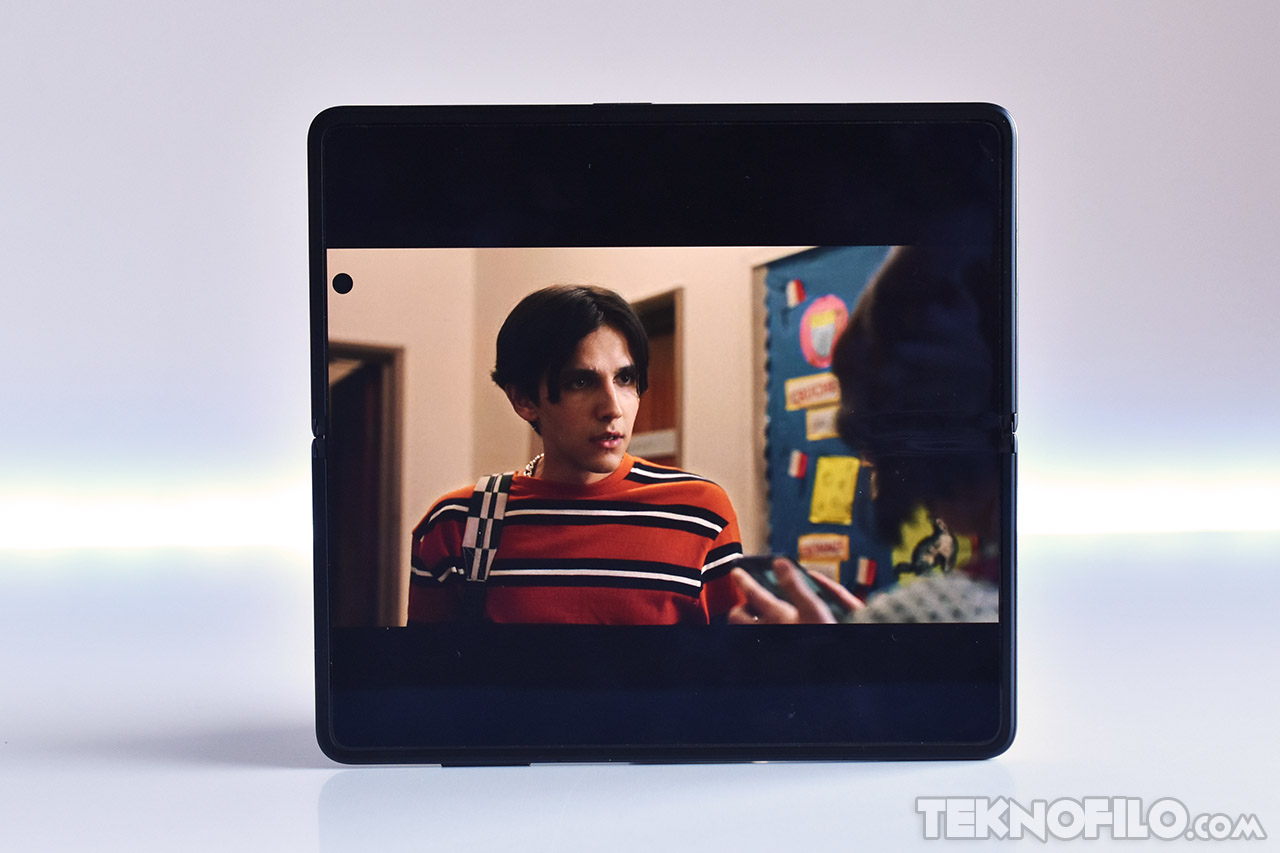 Como ocurre en todos los smartphones plegables, el pliegue vertical es visible si observas la pantalla desde un ángulo, pero resulta invisible si observas la pantalla de frente. Esta pantalla cuenta con un orificio para la cámara frontal en la zona superior de la mitad derecha.