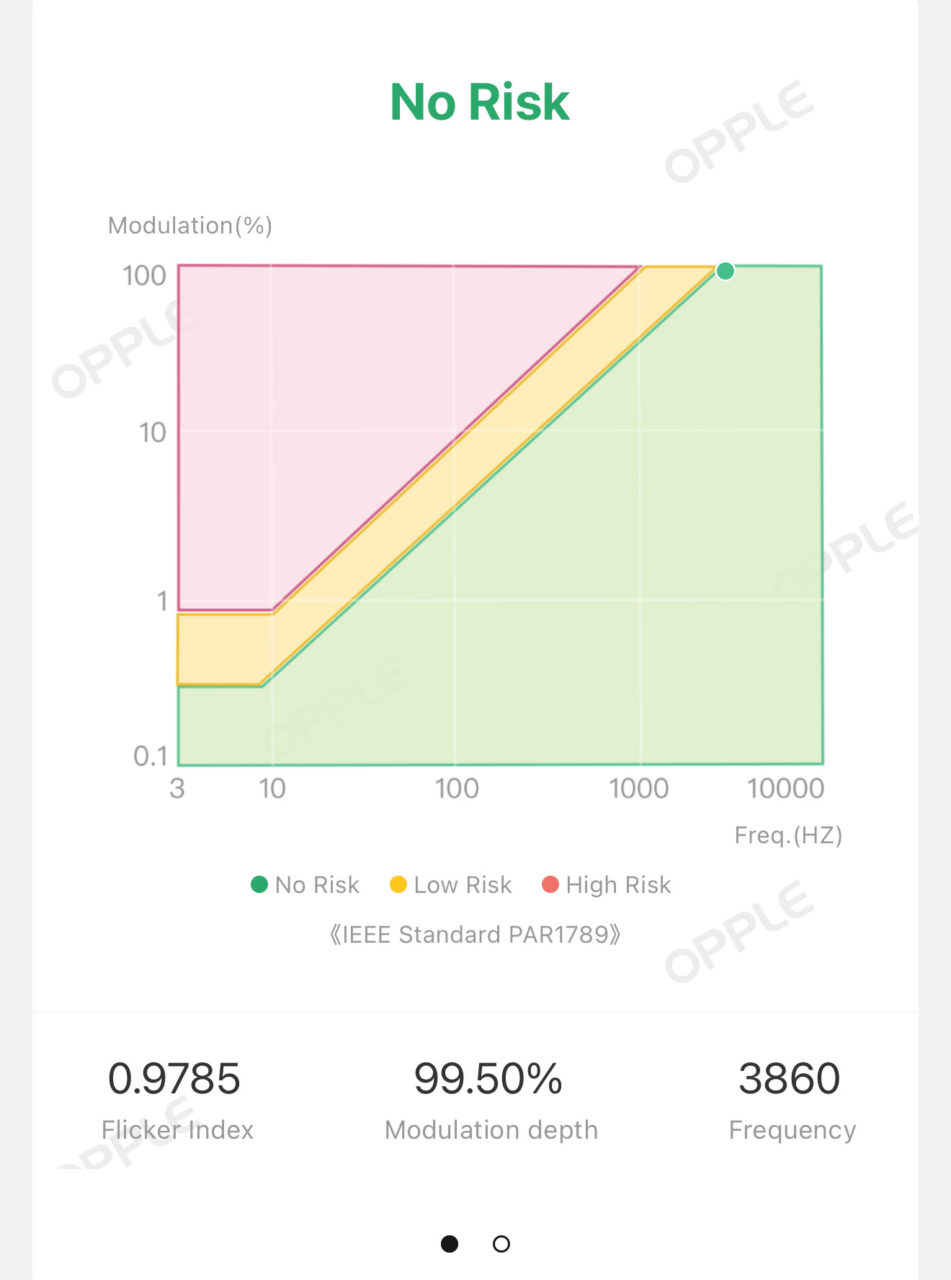 Un valor de 3.840 Hz es extremadamente alto, por lo que si tienes dolores de cabeza tras un uso prolongado del móvil, puede ser buena idea pasarte a un smartphone con alto PWM. Según las mediciones que he tomado, la combinación de frecuencia y modulación de la atenuación PWM hacen que el teléfono no ofrezca ningún riesgo de molestar a la vista a personas con ojos sensibles.