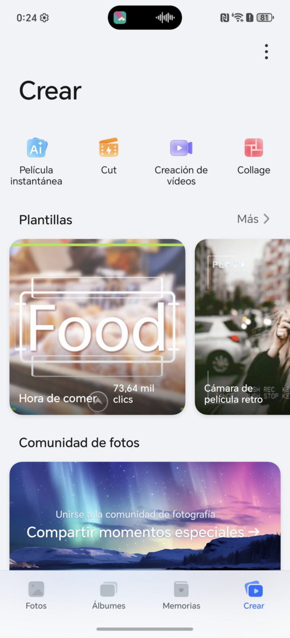 La app de Cámara es bastante estándar. Los modos principales — Noche, Retrato, Foto, Vídeo, Profesional y Más — están dispuestos en un carrusel, y se puede cambiar entre ellos deslizando el dedo.