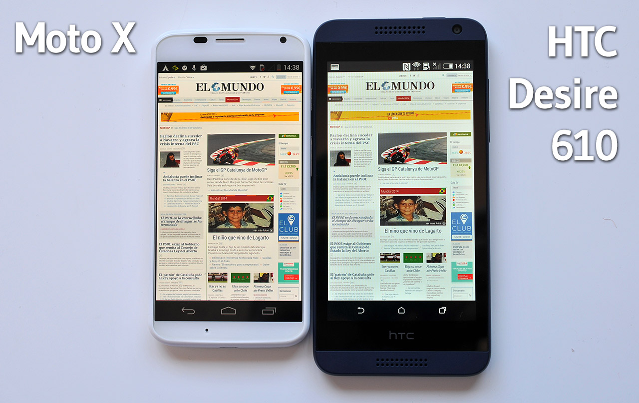 La siguiente imagen muestra una ampliación de las pantallas del Moto X (1280 x 720) y HTC Desire 610 (960 x 540) donde podemos apreciar claramente que la pantalla del Moto X permite leer con facilidad el texto pequeño, mientras que para leer el mismo texto en el HTC Desire 610 tendríamos que hacer zoom.