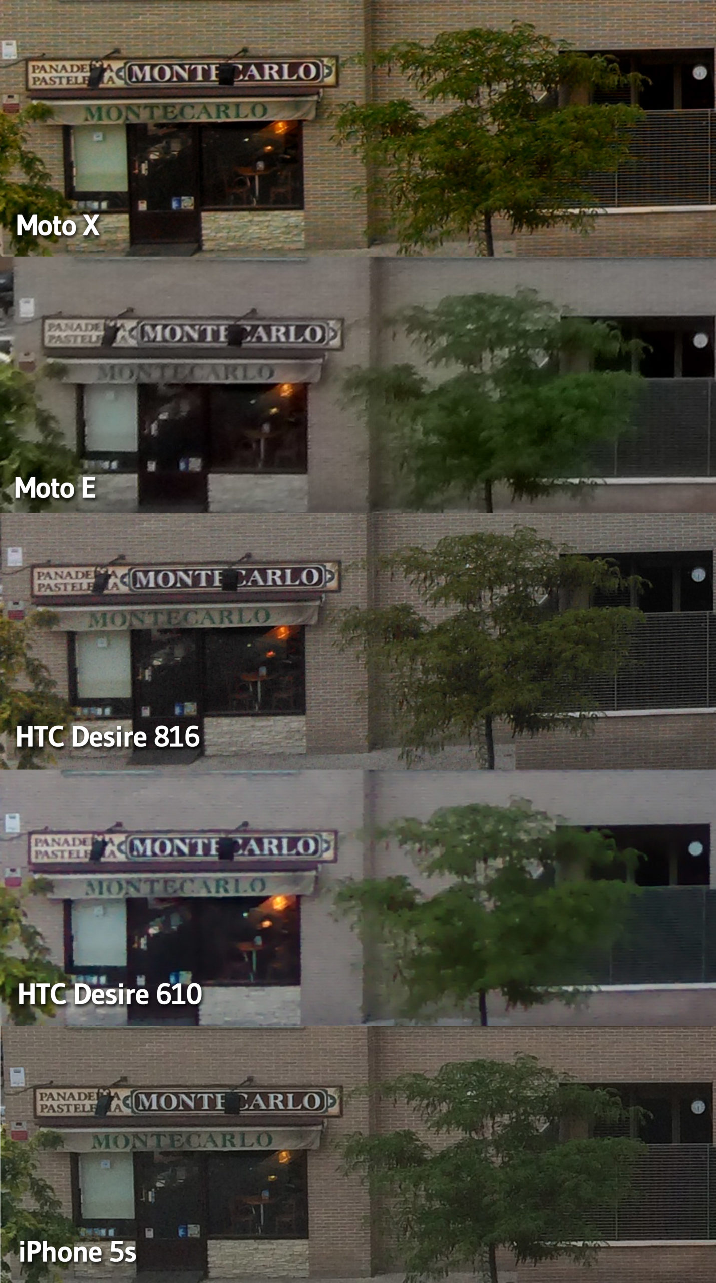 Centrándonos en la calidad de la fotografía, hemos realizado una comparativa de la calidad de la cámara enfrentando al HTC Desire 610 a las cámaras de otros teléfonos de gama media como el HTC Desire 816 (13MP), Moto X (10MP) y Moto E (5MP). Además hemos incorporado un teléfono de gama alta, el iPhone 5s (8MP), para ver cuánto de lejos queda de un dispositivo mucho más caro.
