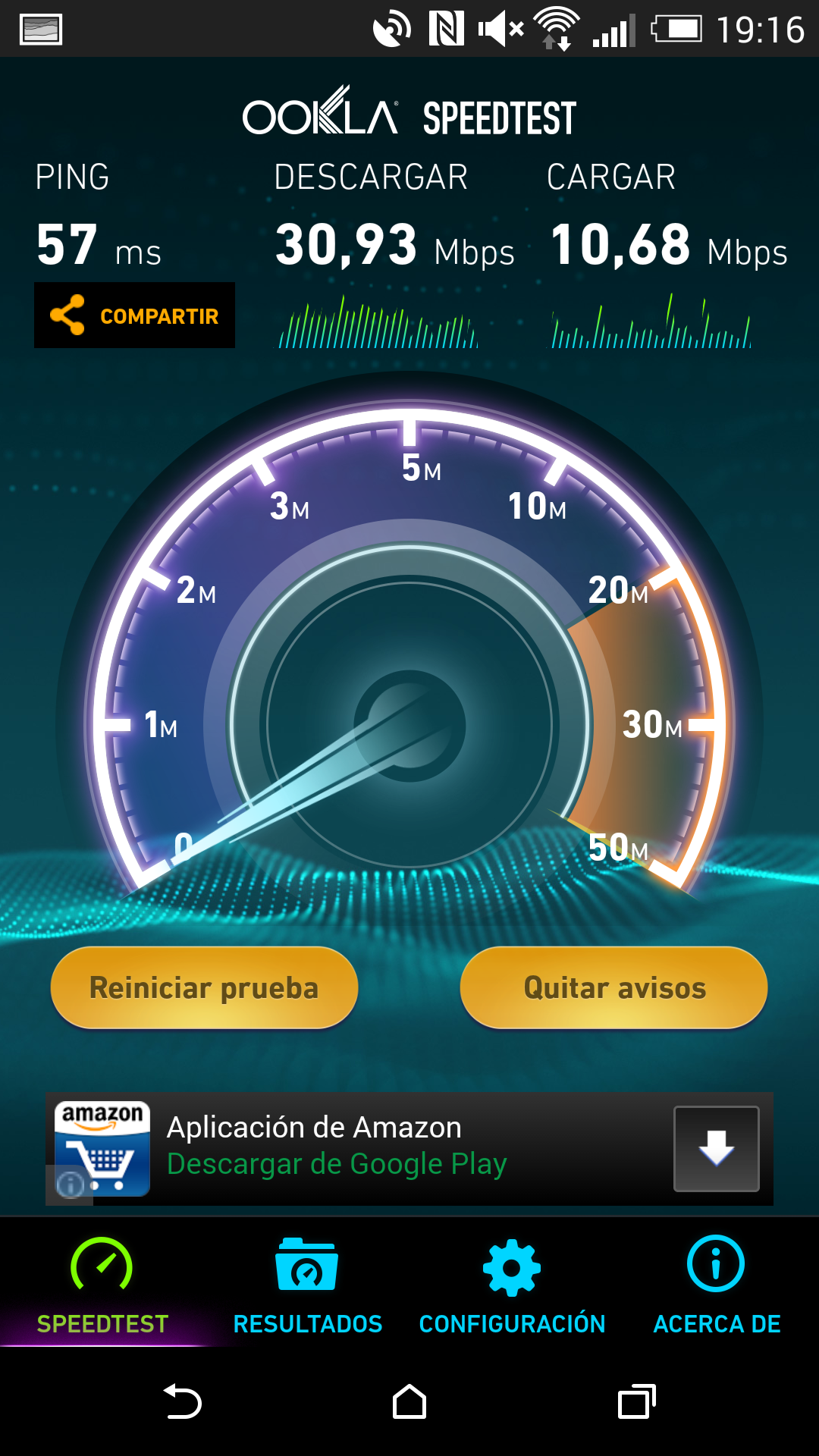 Se alcanzaron los 17 Mbps de bajada y 20 Mbps de subida con una conexión 4G de Movistar.