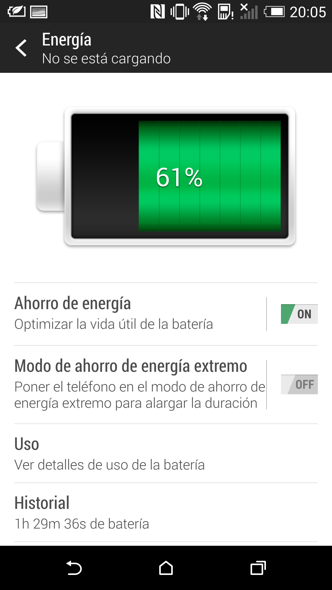HTC afirma que ha mejorado la autonomía de la batería en un 40%, una cifra que a priori resulta difícil de creer dado que la capacidad solo ha aumentado un 13%. HTC ha incluido algunas opciones para ahorrar batería que ya vimos en el HTC One: