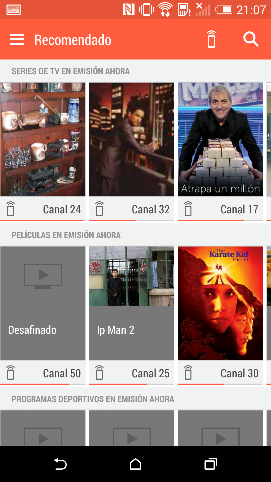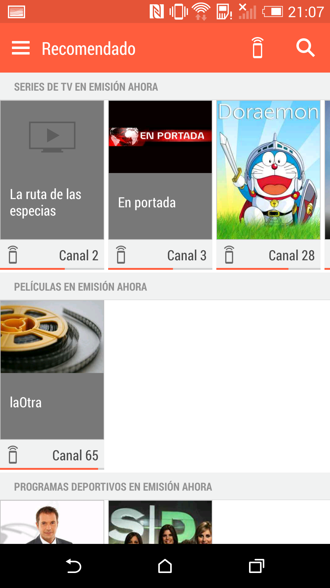 - Deporte: Atletismo, Baloncesto, Balonmano, Ciclismo, Formula 1, Fútbol, Gigantes del basket, Golf, Motociclismo, MotoGP, Motorpasión F1, NBA, Tenis, Sport, UEFA