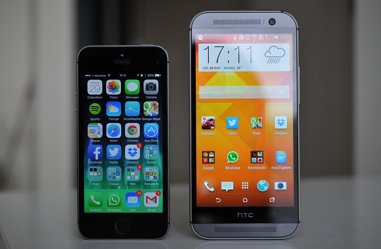 En nuestra opinión, el HTC One M8 posee el diseño más atractivo del mercado junto con el iPhone 5s, y podemos entender por qué HTC se mofa del acabado de plástico de otros terminales. A continuación podemos ver ambos teléfonos uno junto a otro.