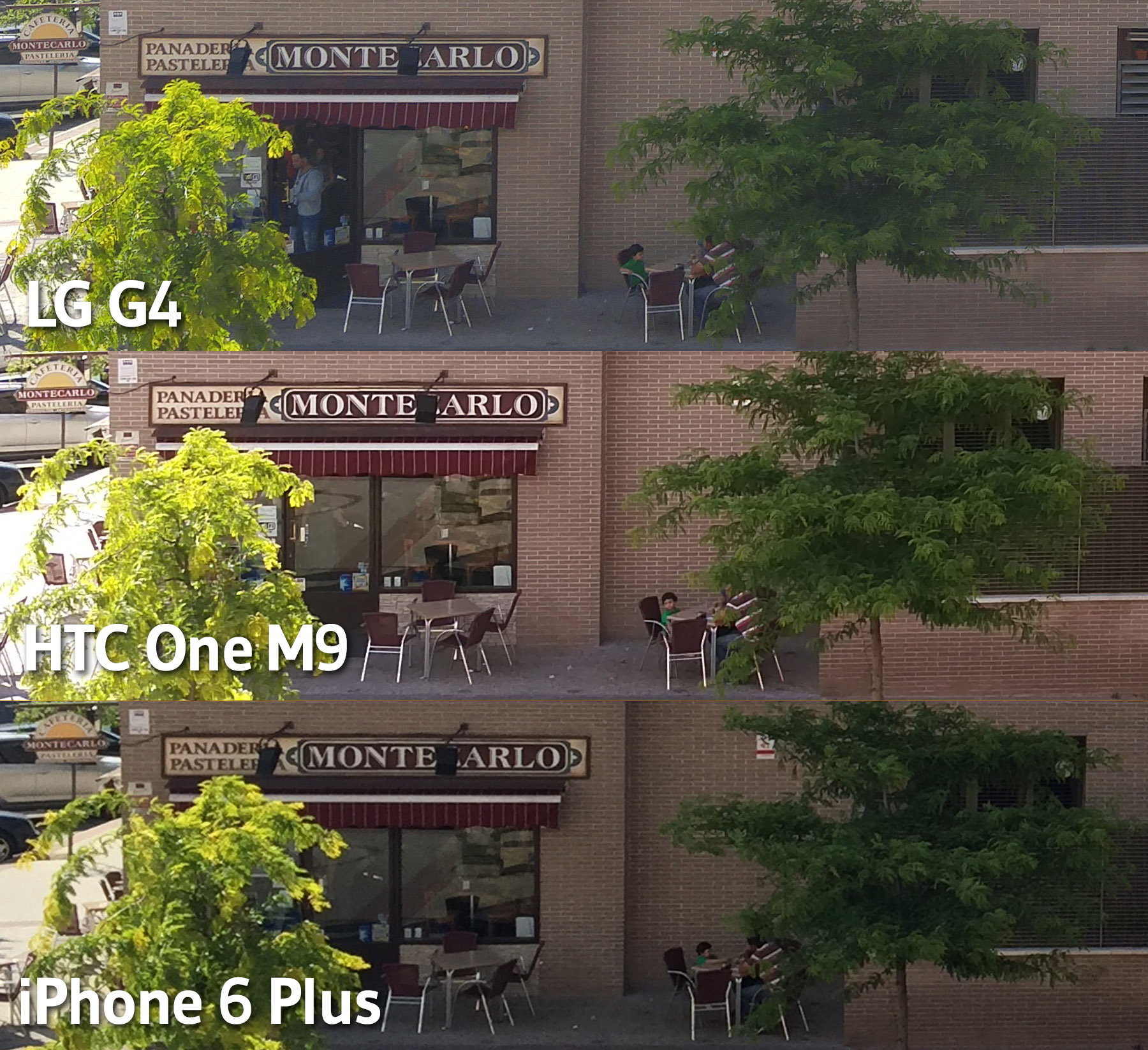 A continuación incluimos otra comparativa del HTC One M9, LG G4 e iPhone 6 Plus a plena luz del día.