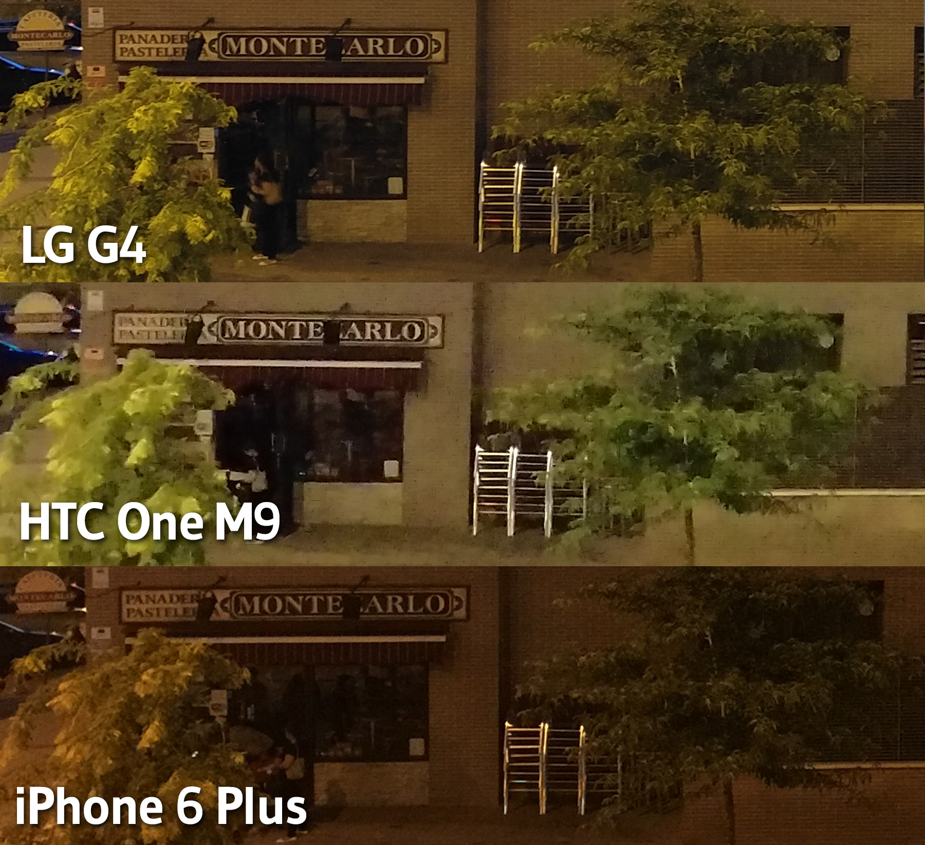 Centrándonos en la calidad de la fotografía, hemos realizado una comparativa de la calidad de la cámara en una escena de poca luz enfrentando al HTC One M9 frente a las cámaras del LG 4 y el iPhone 6 Plus.