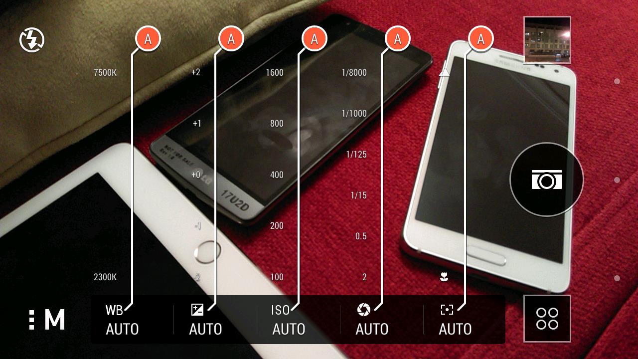 Si activamos el modo manual, en la parte inferior de la pantalla aparecen bastante controles para ajustar diversos parámetros: el balance de blancos, la exposición, la sensibilidad ISO, el tiempo de disparo, y la distancia de enfoque. La siguiente anterior muestra estos ajustes sobre la pantalla.