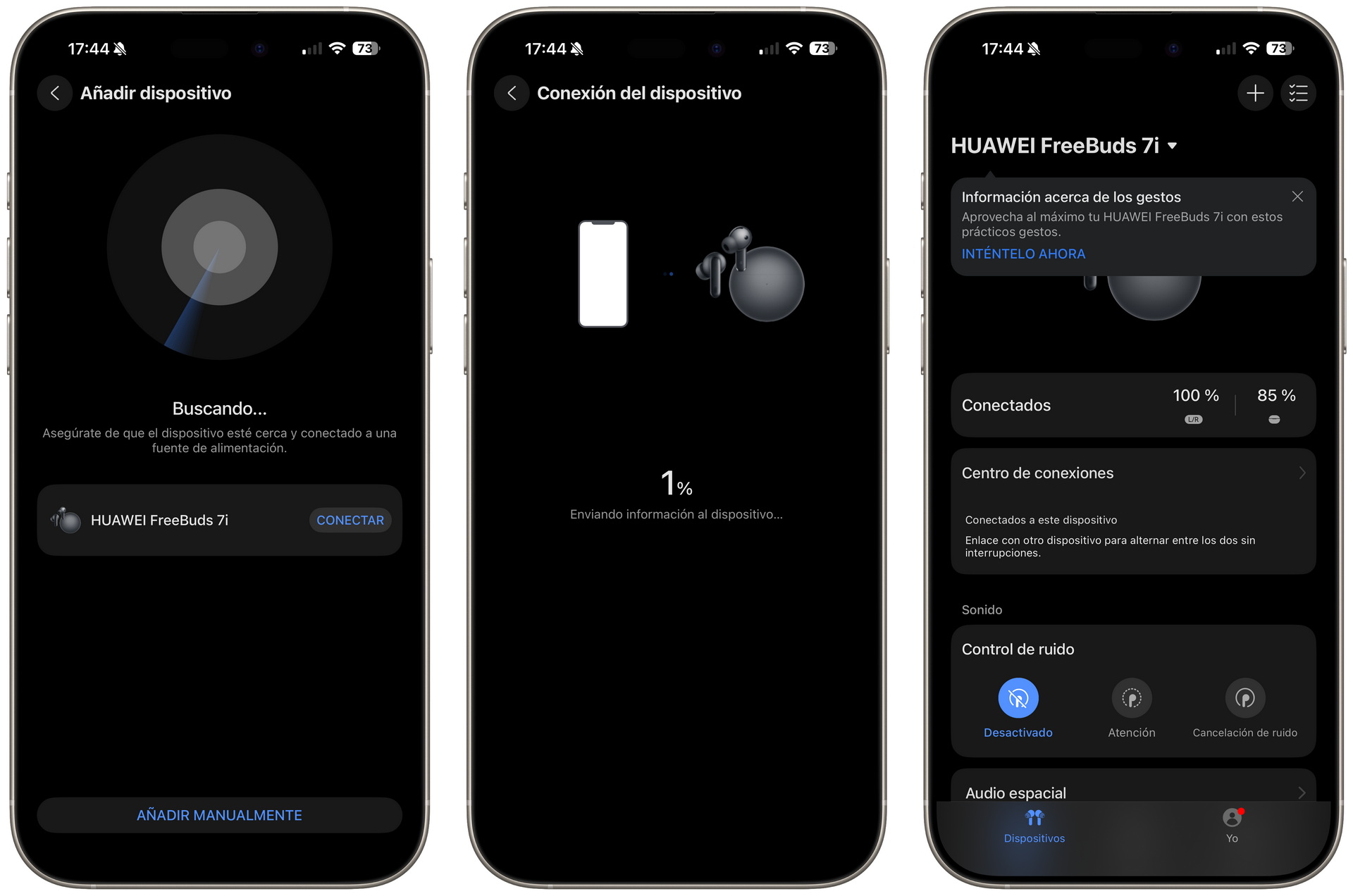 Nada más introducir los FreeBuds 7i en los oídos, se escucha un sonidito que indica que ya están listos para funcionar. La conexión con el smartphone se realiza mediante Bluetooth 5.4.
