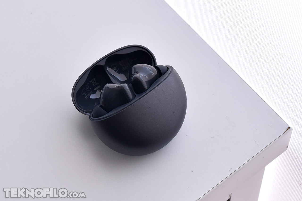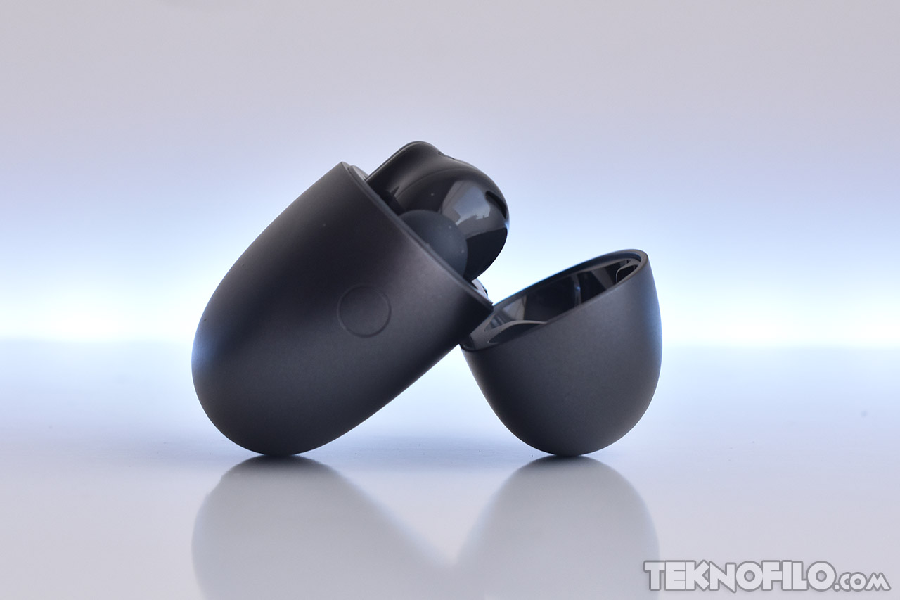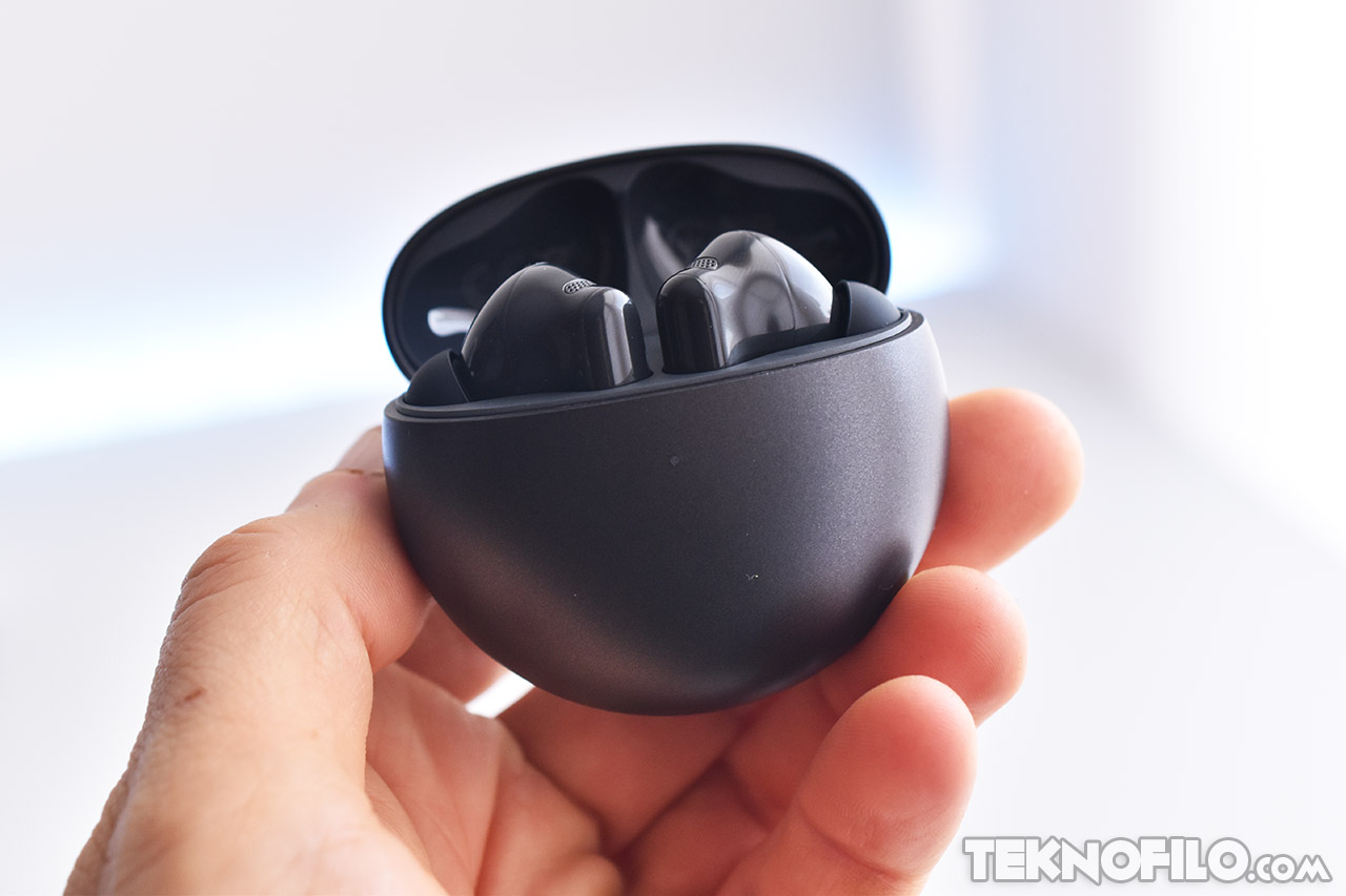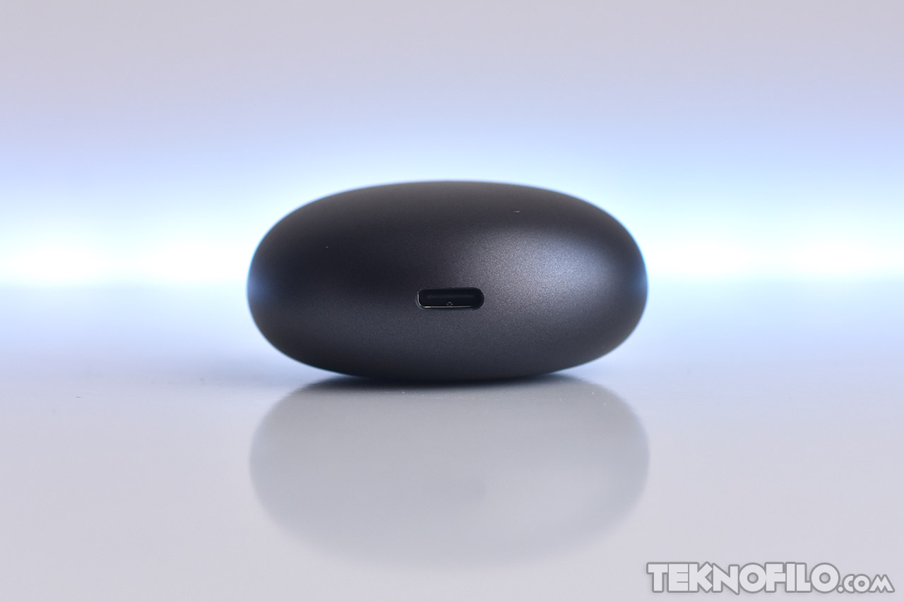 La forma ovalada del estuche de carga con bordes suaves y una bisagra invisible, resulta cómoda de sujetar y se abre con una sola mano. En el frontal, un pequeño LED indica el estado de la batería, mientras que en la base encontramos el puerto USB-C. El estuche pesa poco más de 35 gramos, por lo que se transporta fácilmente en el bolsillo o la mochila.