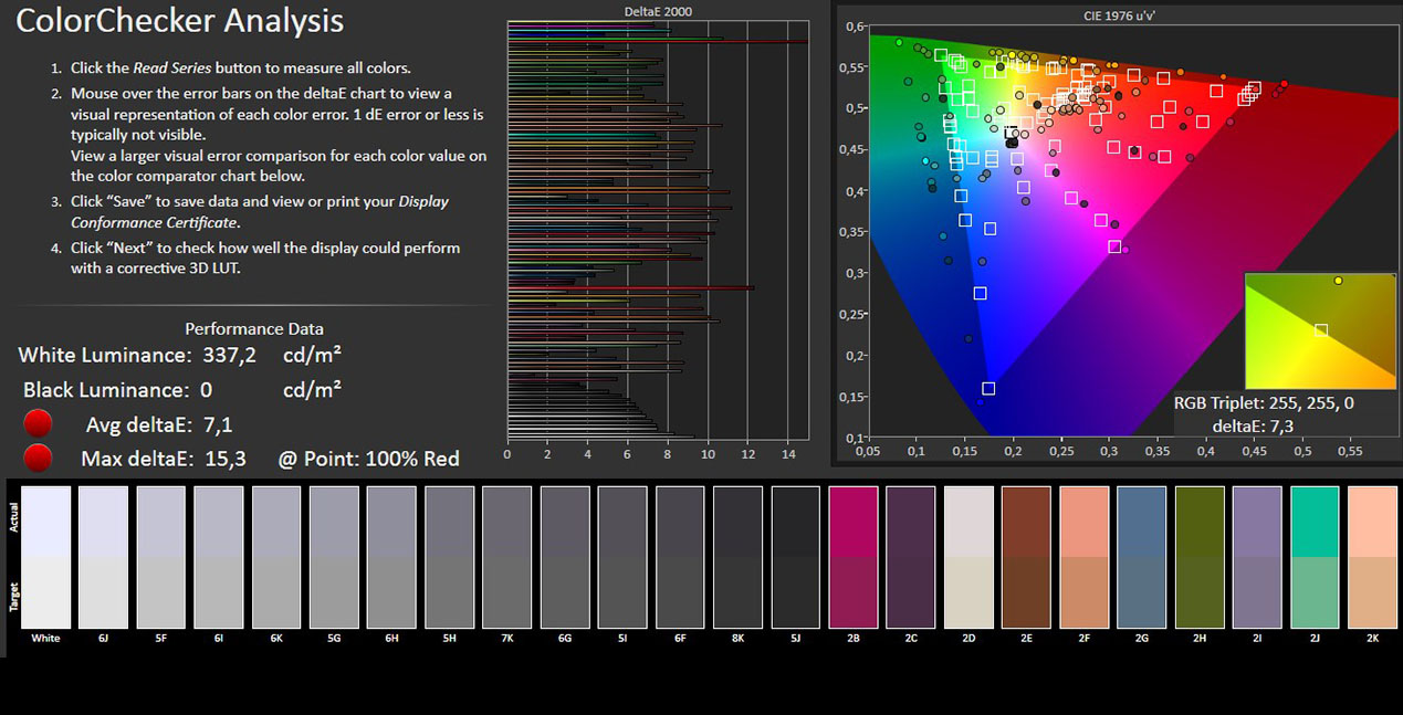 Con la temperatura de la pantalla ajustada a 6500ºK, el valor medio de Delta E se ha reducido ligeramente a 6.1 dE, con un valor máximo de 14.6 dE. Por tanto parece que el problema de la falta de fidelidad de color no es fácilmente solucionable.
