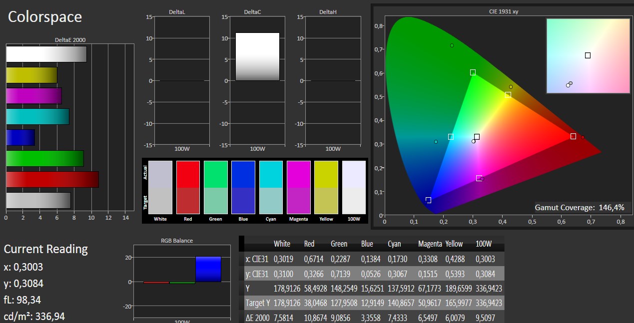 Para analizar la calidad de la pantalla hemos realizado diversas pruebas con el software profesional CalMAN Ultimate y un colorímetro X-Rite i1Display Pro.