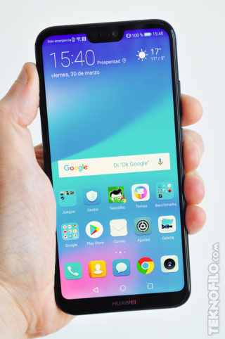 El marco inferior de la pantalla es bastante estrecho pero, por alguna extraña razón, Huawei no ha colocado allí el lector de huella — algo que sí que ha hecho en el P20 y P20 Pro — sino que ha dejado ese espacio desaprovechado, sin ningún uso. Personalmente hubiera preferido tener delante el lector de huella, pero es algo que va por gustos.