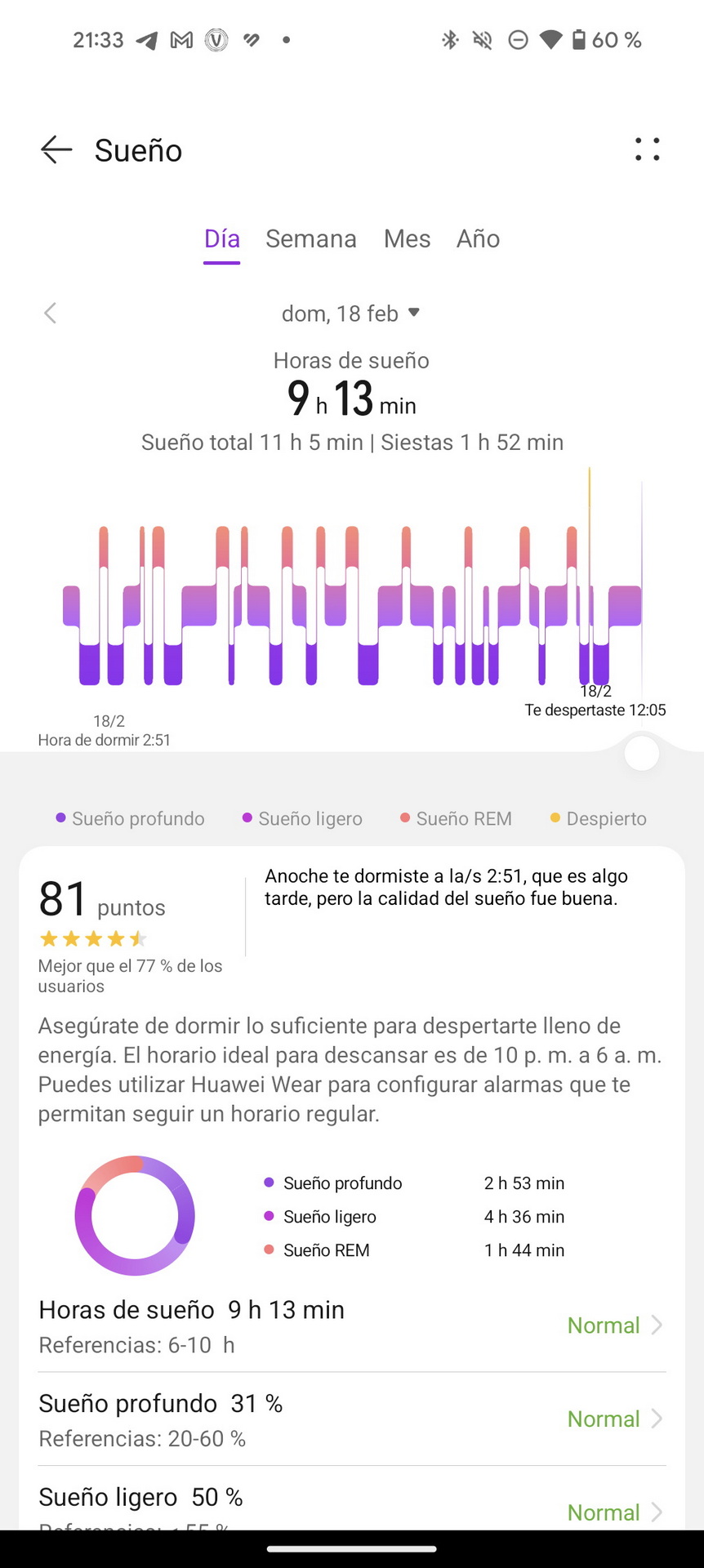 • Sueño, que muestra las horas de sueño totales de cada día y las horas en cada fase (profundo, liviano, REM).