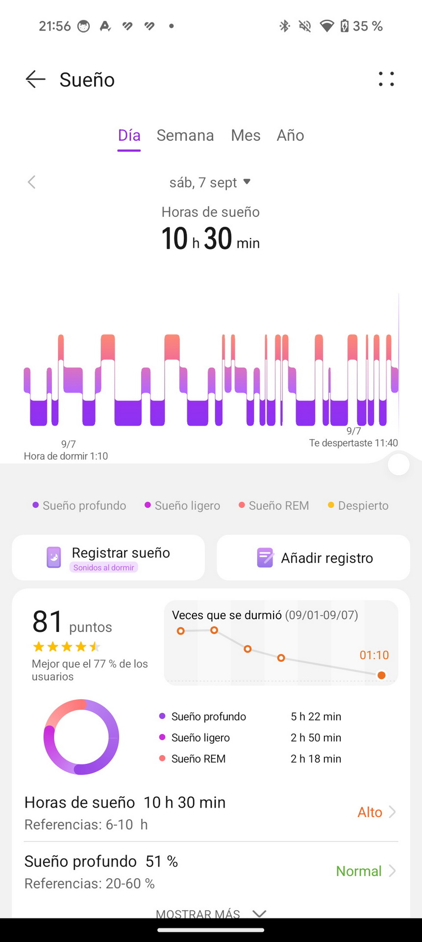 - Sueño, que muestra las horas de sueño totales de cada día y las horas en cada fase (profundo, liviano, REM).