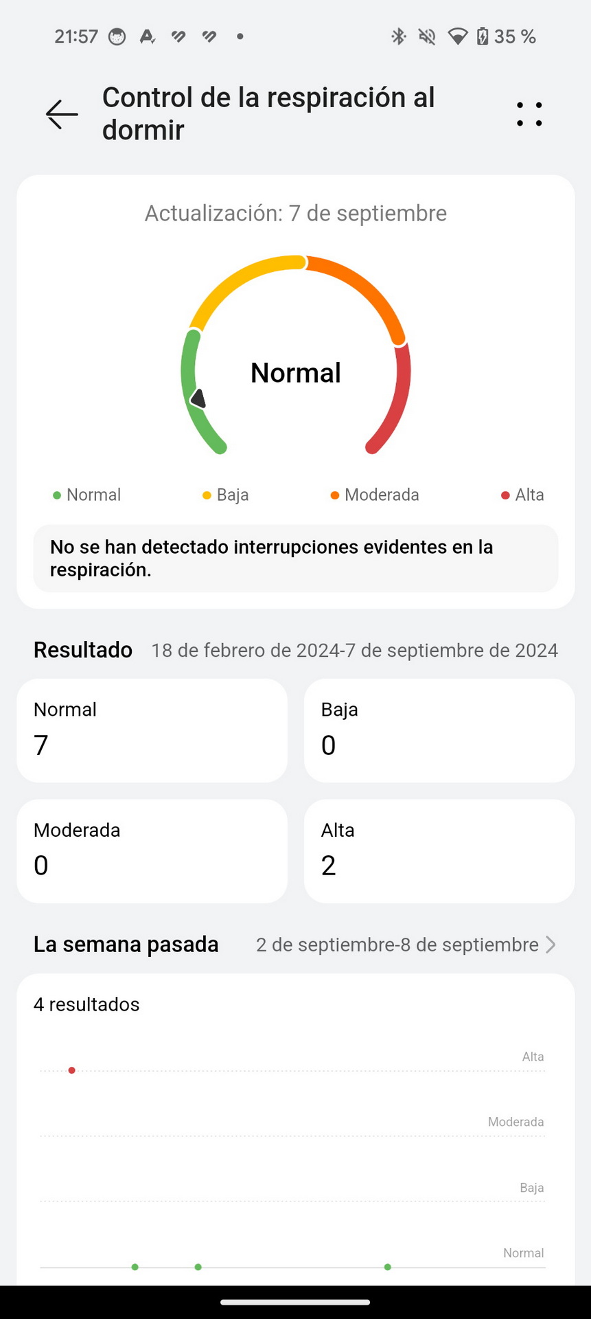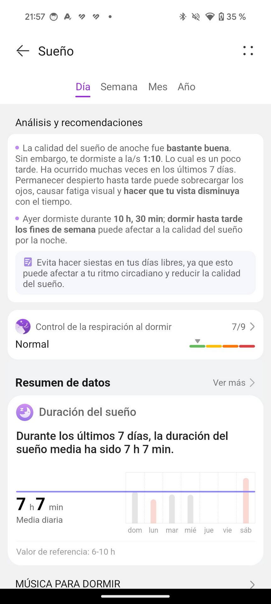 - Control de la respiración al dormir: Muestra información sobre tu respiración por la noche, incluyendo si se han detectado interrupciones evidentes.