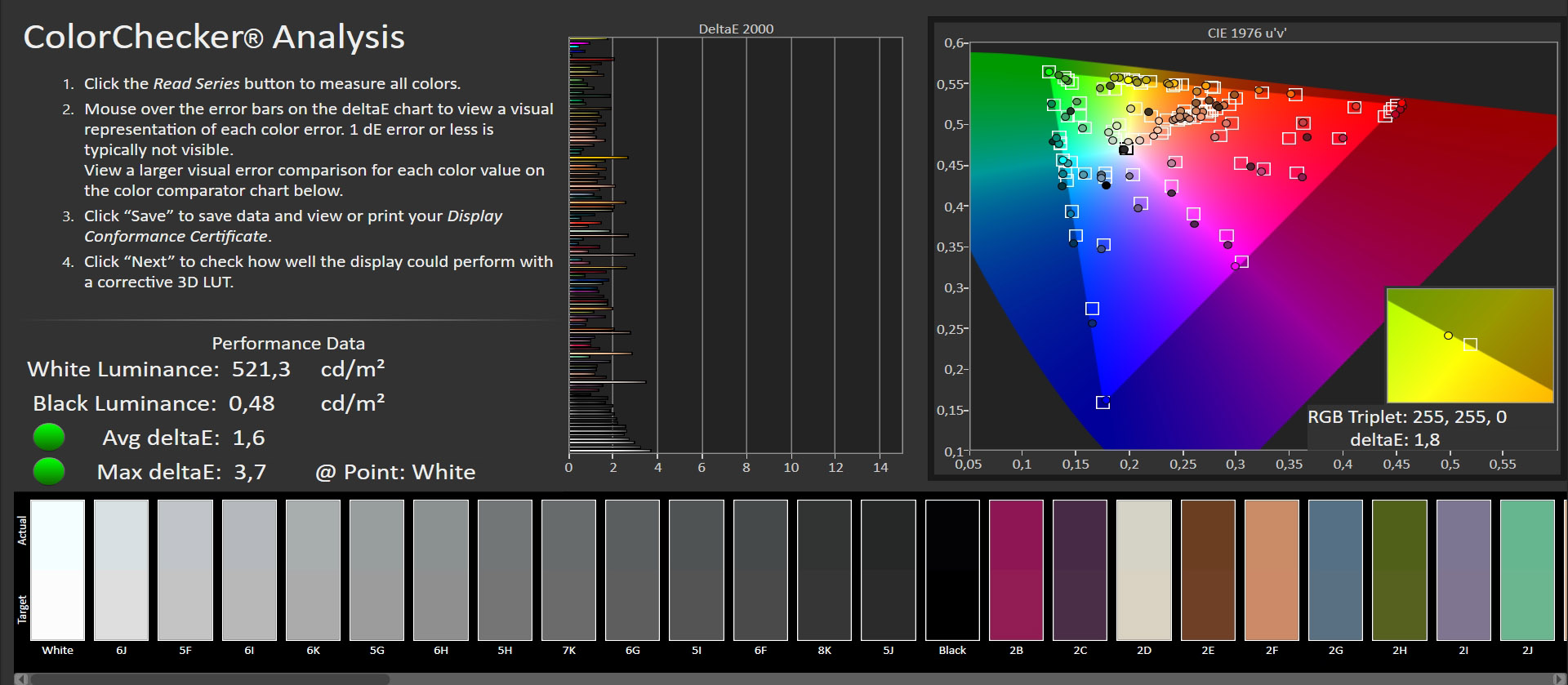 El error medio en la fidelidad de los colores en el espacio sRGB es excelente, ya que resulta ser 1.5 dE (un valor por debajo de 4 dE se considera excelente y por encima de 9 se considera inaceptable), y el error máximo es 3.8 dE, de nuevo un valor espectacular.