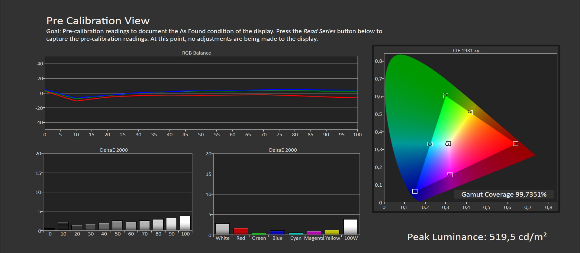Para analizar la calidad de la pantalla hemos realizado diversas pruebas con el software profesional CalMAN Ultimate y un colorímetro X-Rite i1Display Pro.