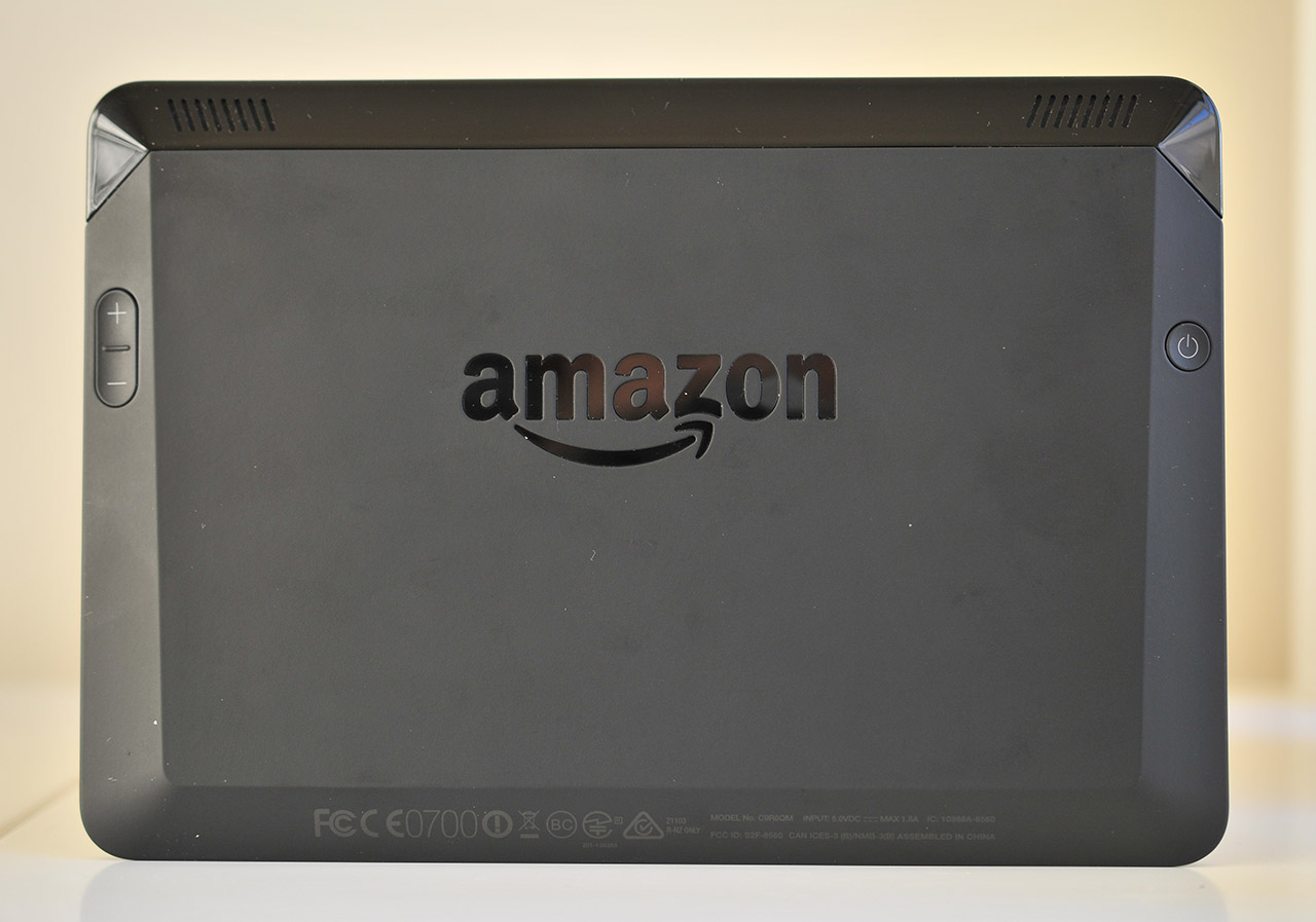 En el centro de la parte de atrás está incrustado el logotipo de Amazon en plástico brillante. A la izquierda, cerca del borde del tablet, podemos ver los botones de volumen, y a la derecha encontramos el botón de encendido también cerca del borde.