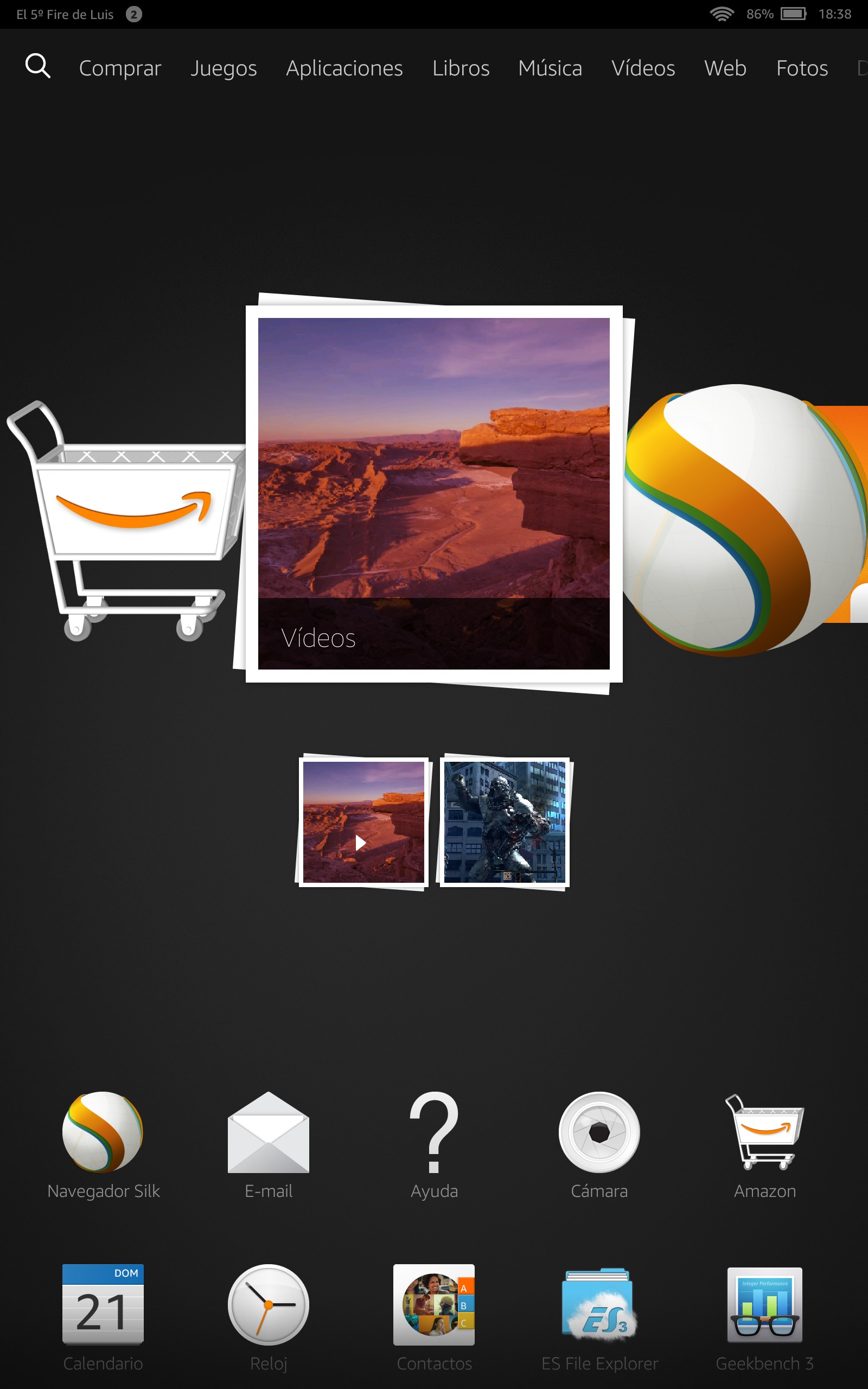 Al encender el Kindle Fire HDX accedemos al menú de inicio, que muestra en la parte superior 10 accesos directos a otras tantas pestañas: Comprar, Juegos, Aplicaciones, Libros, Música, Vídeos, Web, Fotos, Documentos y, en los dispositivos subvencionados con anuncios, Ofertas.