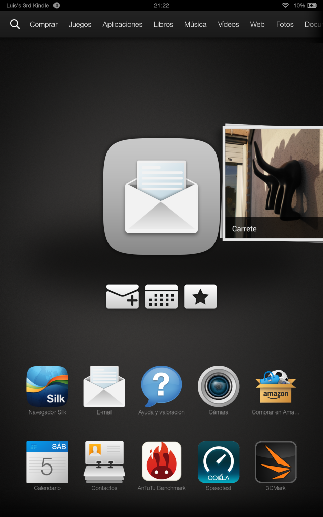 Al encender el Kindle Fire HDX accedemos al menú de inicio, que muestra en la parte superior 10 accesos directos a otras tantas pestañas: Comprar, Juegos, Aplicaciones, Libros, Música, Vídeos, Web, Fotos, Documentos y, en los dispositivos subvencionados con anuncios, Ofertas.