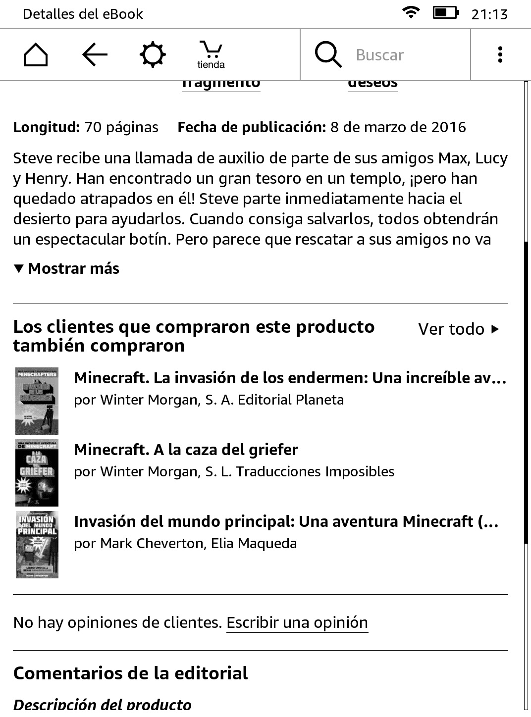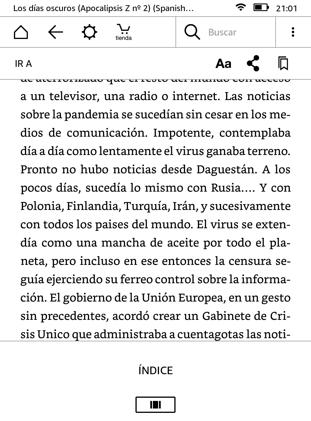 Estando dentro de un libro, basta con tocar la parte superior de la pantalla para acceder al menú, desde el cual podemos ir a la página principal, ir atrás, ajustar la iluminación de la pantalla, comprar un nuevo libro, realizar una búsqueda, ajustar el tamaño de letra, compartir un contenido, marcar una página o acceder a más opciones.