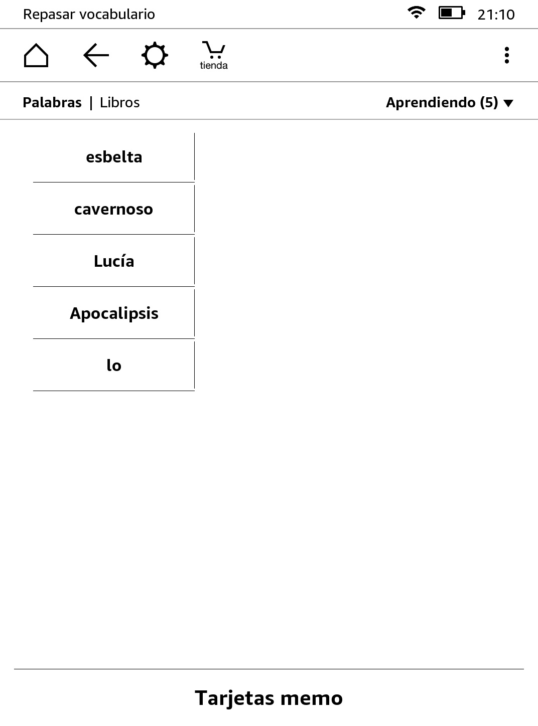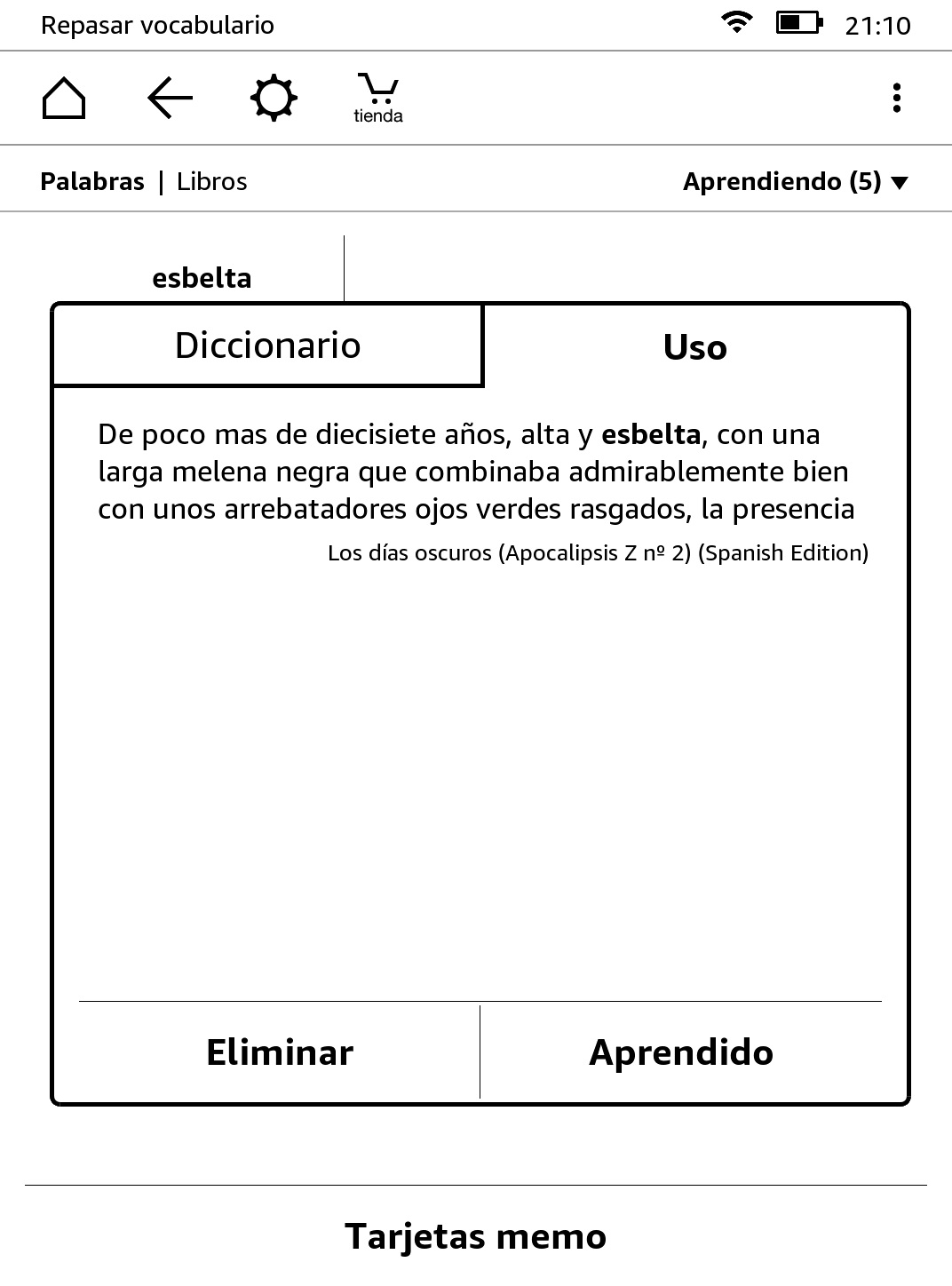 Las palabras que buscas quedan almacenadas en la sección «Repasar vocabulario», en caso de que quieras repasar las palabras que desconocías y aumentar tu vocabulario. También proporciona unas «tarjetas memo» en las que puedes ver la palabra en el fragmento donde la leíste, acceder a la definición y marcar la palabra como aprendida.