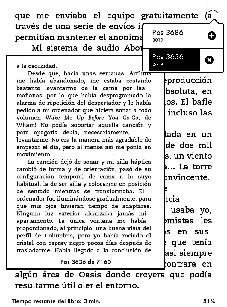 Una de las mejoras que incorpora el nuevo Kindle Paperwhite es que ahora es posible marcar una página de forma muy sencilla, con tan solo dos pulsaciones, así como ver todos los marcadores que tenemos guardados en el libro. Pulsando sobre un marcador vemos una miniatura de la página, de forma que podemos saber rápidamente si es donde queremos ir.