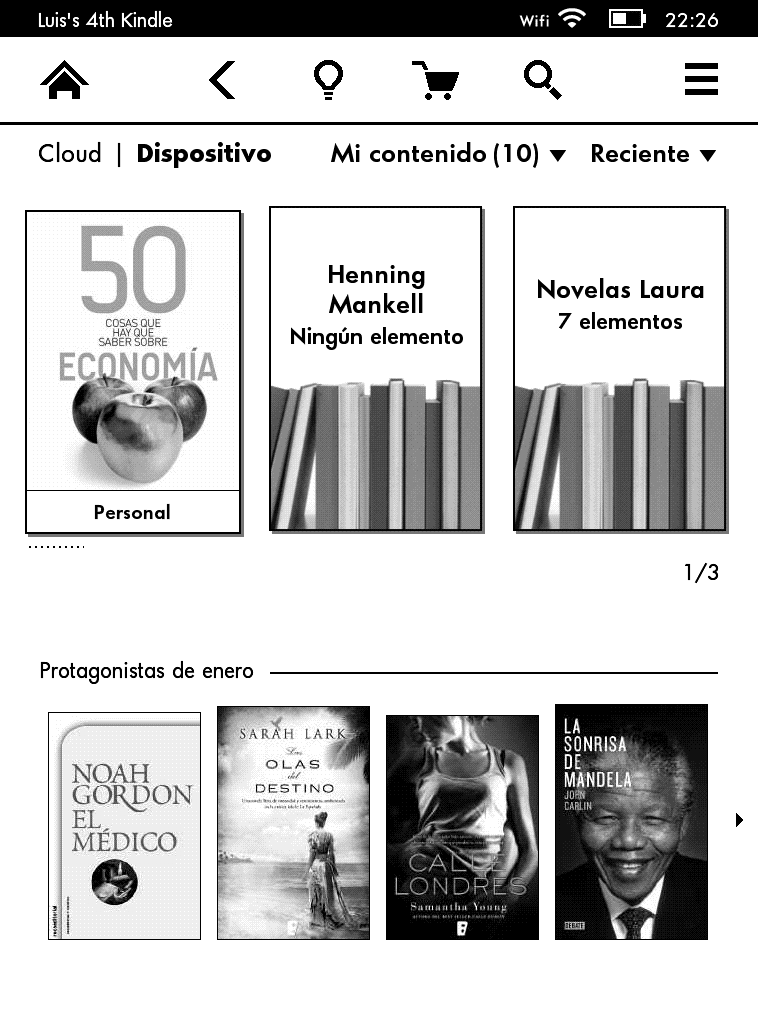Tocando en la parte superior de la pantalla accedemos al menú, desde el cual podemos ir a la página principal, ir atrás, ajustar la iluminación de la pantalla, comprar un nuevo libro, realizar una búsqueda o acceder a más opciones.
