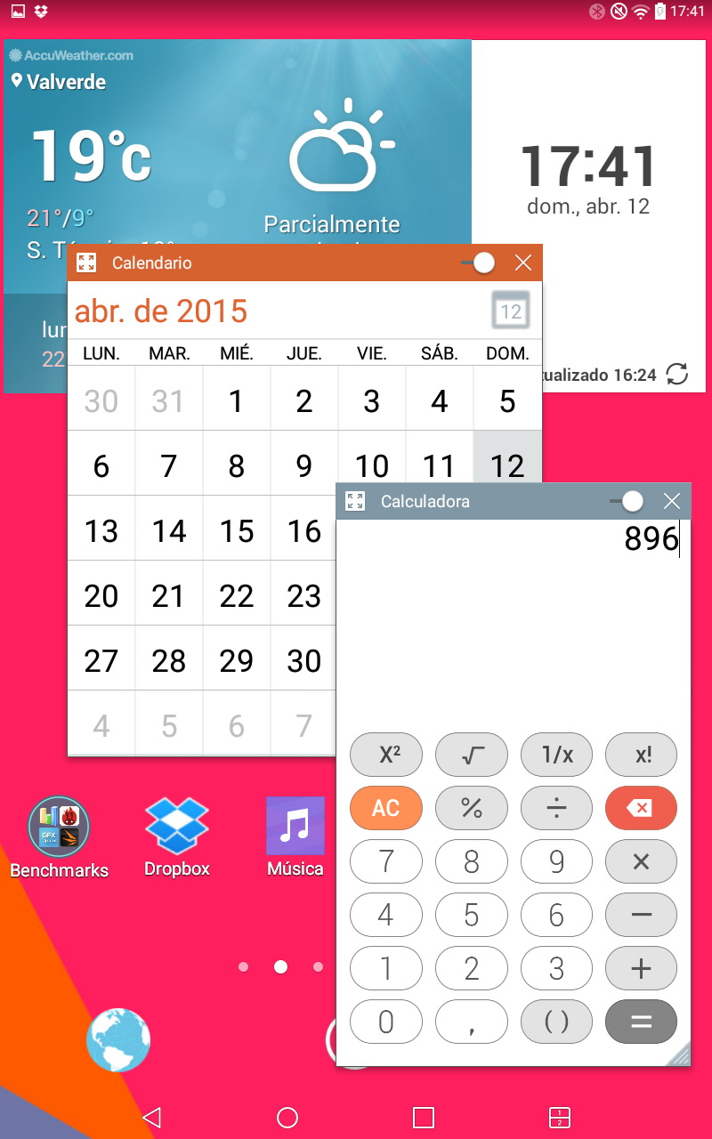 Uno de los elementos más característicos del interfaz de LG son las aplicaciones QSlide, que están presentes desde hace tiempo en los dispositivos de la compañía. Se trata de 8 aplicaciones – Vídeo, Internet, Calendario, E-mail, Gestor de archivos, y Calculadora – que se ejecutan en una pequeña ventana y que nos permiten seguir utilizando el tablet para otras tareas. Lamentablemente no es posible utilizar cualquier aplicación en una ventana, sino únicamente una de las indicadas.