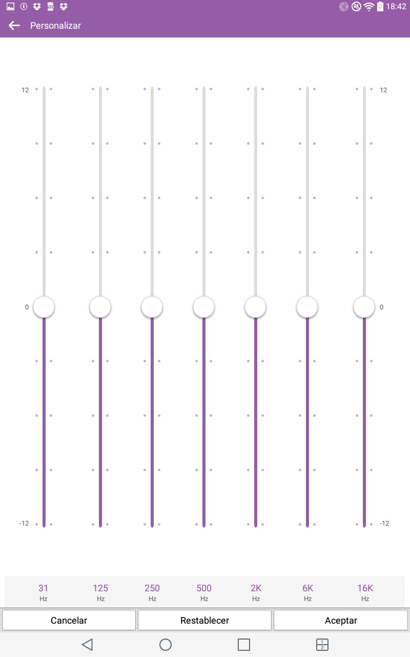 El reproductor de música permite aplicar seis efectos de audio: normal, pure surround, quadbeat, reforzador de bajos, reforzador de agudos, reforzador de vocalización, y personalizar (en esta última opción aparece un ecualizador de 7 bandas).