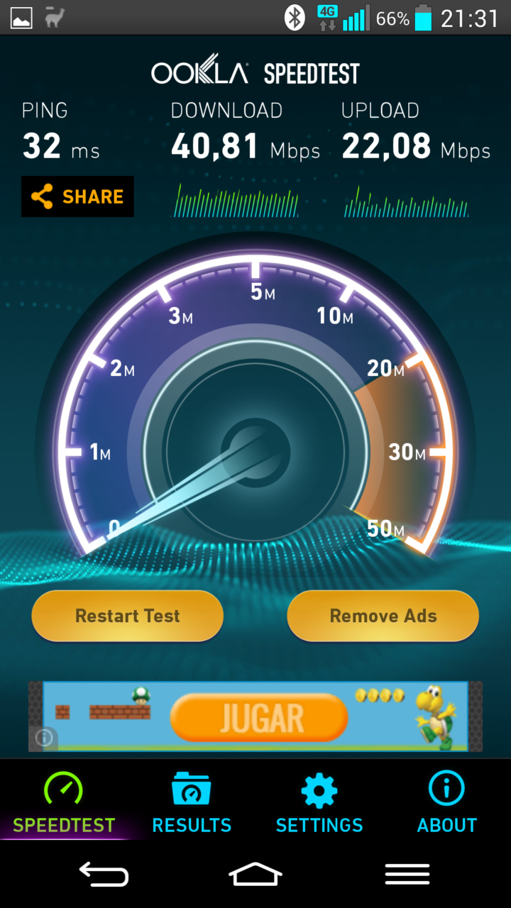 En las pruebas que hemos realizado la velocidad de red tanto por Wi-Fi como por 4G fueron muy satisfactorias. En las pruebas de velocidad el LG G2 alcanzó los 27 Mbps de bajada y 10 Mbps de subida en Wi-Fi con una conexión de fibra óptica y, todavía más, 41 Mbps de bajada y 22 Mbps de subida con una conexión 4G de Vodafone.