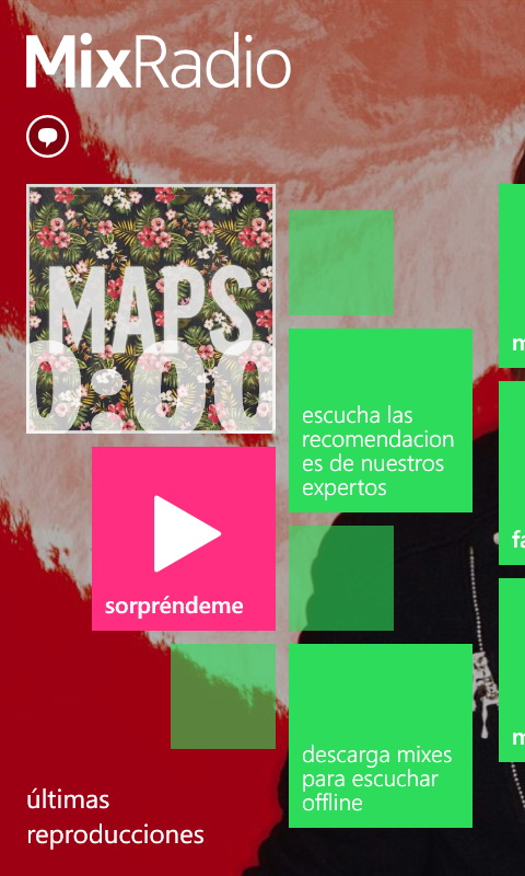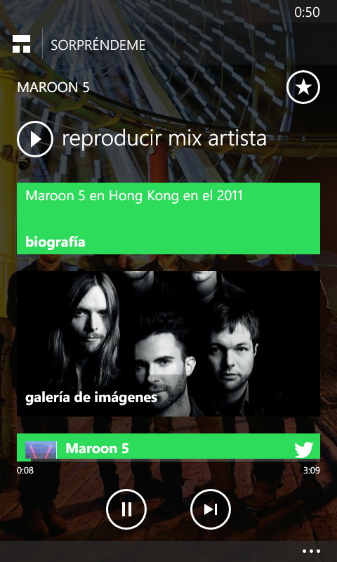 A la hora de reproducir música, MixRadio muestra información interesante sobre el artista que interpreta la canción, como su biografía, su último tweet, su próximo concierto y la lista de mezclas en las que aparece. Además nos permite iniciar una mezcla basada en ese artista con solo pulsar un botón.