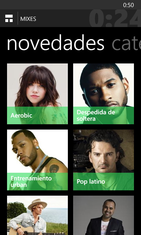 MixRadio ofrece dos tipos de mezclas de canciones. Por un lado tenemos a nuestro alcance una gran variedad de mezclas ya hechas, organizadas por géneros musicales y por temas – por ejemplo, top semanal, hits veraniegos, canciones de viaje, etc.