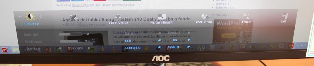 La interfaz OSD del monitor AOC E2461FWH se activa con el botón superior del conjunto de botones situados detrás del monitor. Es de destacar que este menú cuenta con un nivel de transparencia que en todo caso es ajustable si resulta incómodo su manejo respecto a la pantalla de fondo.