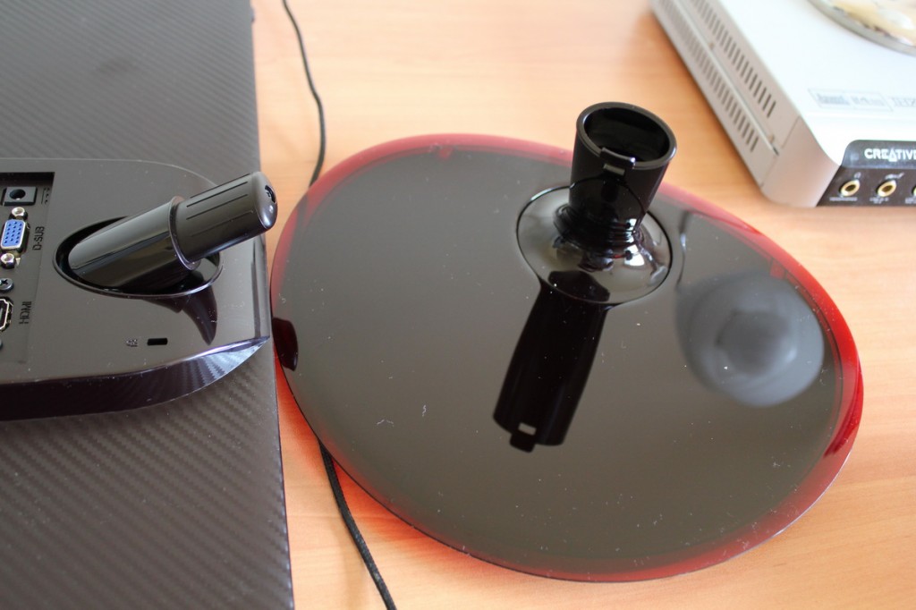 La base ovalada se atornilla al brazo de soporte con una pieza que facilita enganchar ambos elementos, común a lo que nos encontramos en la mayoría de los monitores actuales: